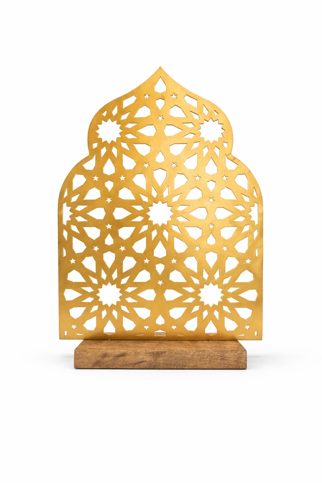 A celebration of Islamic artistry, this filigree arch silhouette adds a touch of refined elegance to your Ramadan décor. Crafted with intricate geometric latticework inspired by traditional mosque architecture, the piece casts delicate patterns of light and shadow, creating a serene and sophisticated ambience. Its warm neutral finish and sculptural presence make it a versatile accent for mantels, consoles, or curated Ramadan vignettes.