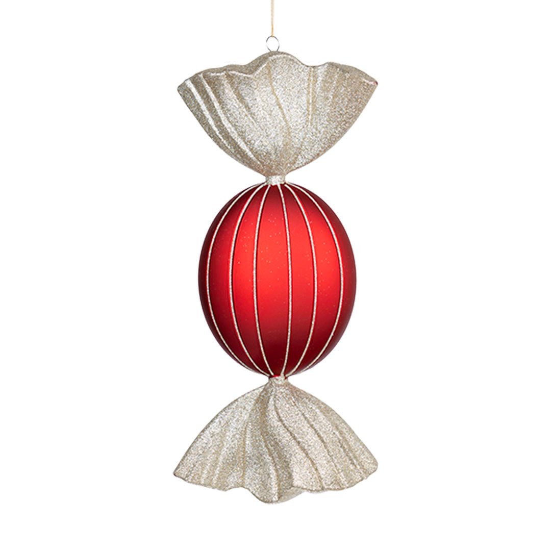 Bring festive charm to your holiday décor with the 18.5" Matte Red & Champagne Candy Ornament. Crafted in an oval candy shape, this oversized ornament features a matte red base accented with a sparkling champagne glitter line and tail. Made from lightweight PET, it’s perfect for large Christmas trees, garlands, or wreaths, and also works beautifully in table centerpieces or mantel displays. At 18.5" tall, it’s a striking focal piece that adds a playful yet elegant touch to candyland, classic red-and-gold, or glam holiday themes.