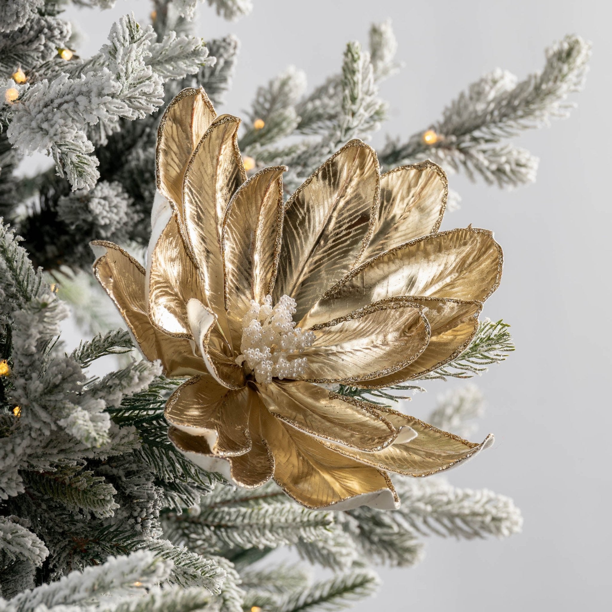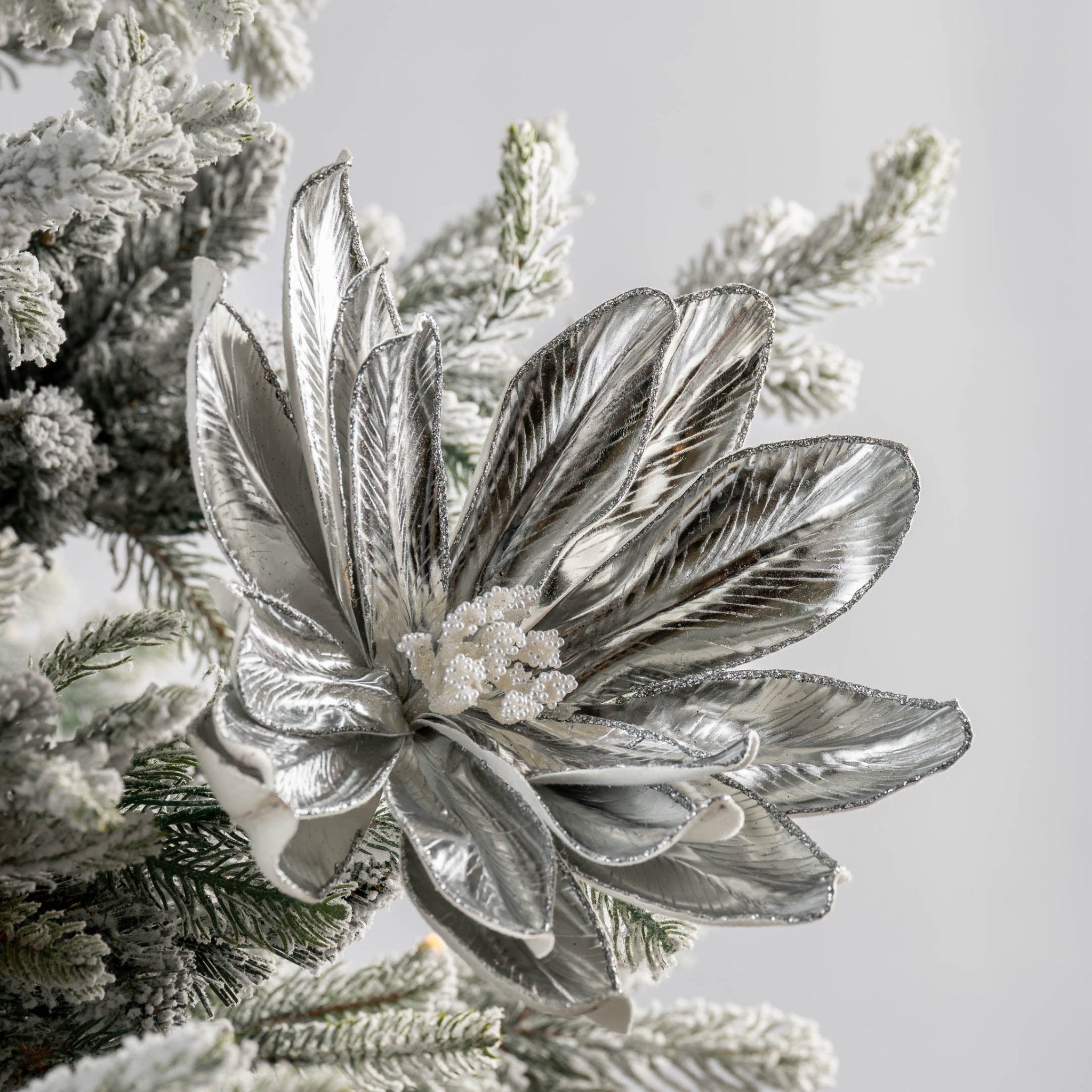 Bring timeless elegance to your holiday décor with the Blooming Magnolia Pick, a stunning accent piece designed to add sophistication and festive charm to any setting. Featuring delicately layered metallic petals and luminous pearl bud accents, this pick captures the beauty of magnolia blooms in full flourish. Its gentle shimmer creates a soft, enchanting glow, making it a perfect choice for romantic trees, winter wonderland themes, or luxurious floral arrangements. Whether cascading through your Christmas tree, enhancing wreaths, or elevating table centerpieces, this magnolia pick effortlessly blends classic elegance with modern festive style, creating a truly captivating seasonal display.
