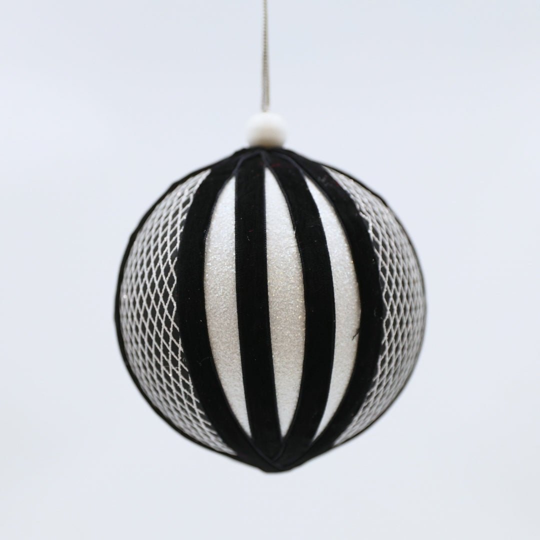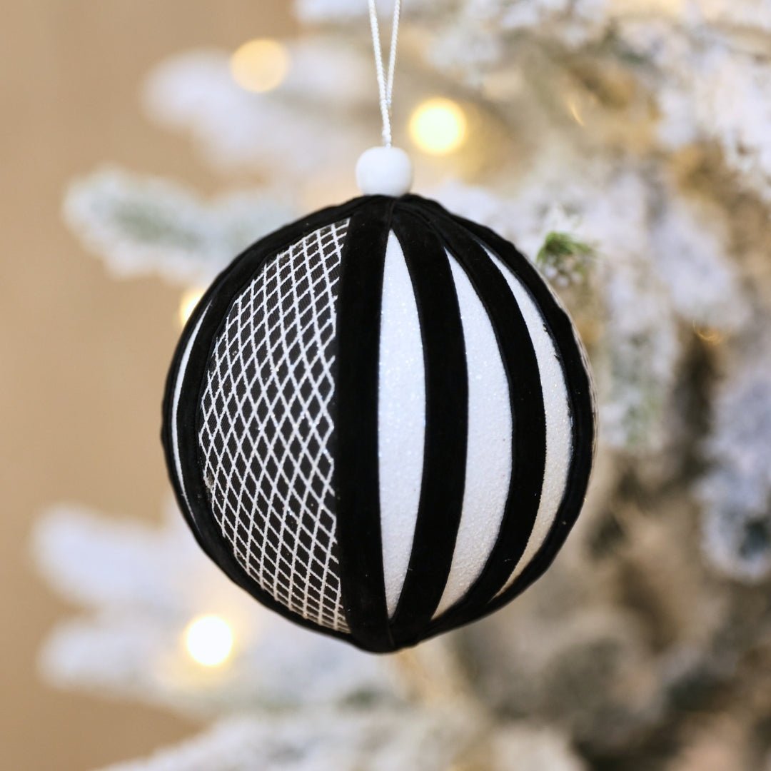 Elevate your decor with this refined velvet ornament, featuring a cross hatch texture in timeless monochrome. Plush and sophisticated, it adds modern elegance to contemporary or classic holiday trees.