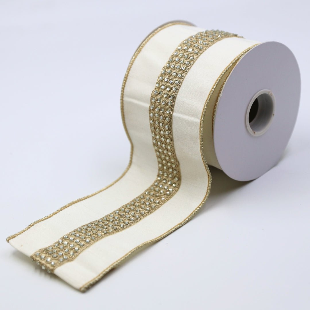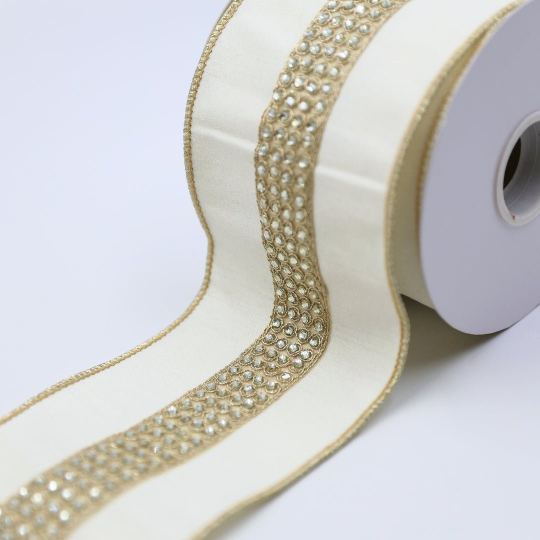 Add refined sparkle to your décor with the Ivory Dupion Ribbon, featuring elegant diamond trim and a matching dupion back. Perfect for holiday trees, garlands, wreaths, staircases, and upscale gift wrapping. Available in 4" × 5 yards and 4" × 10 yards.