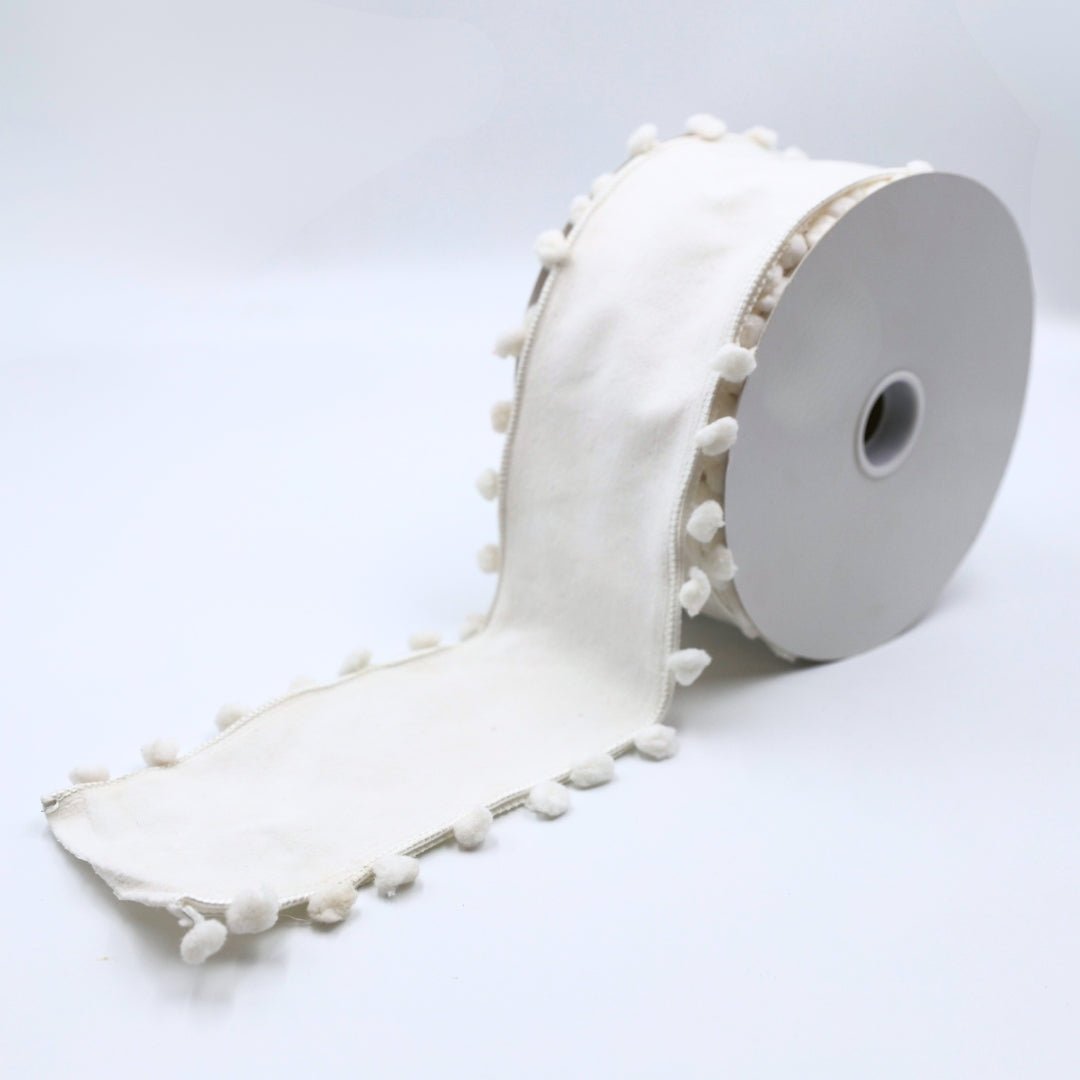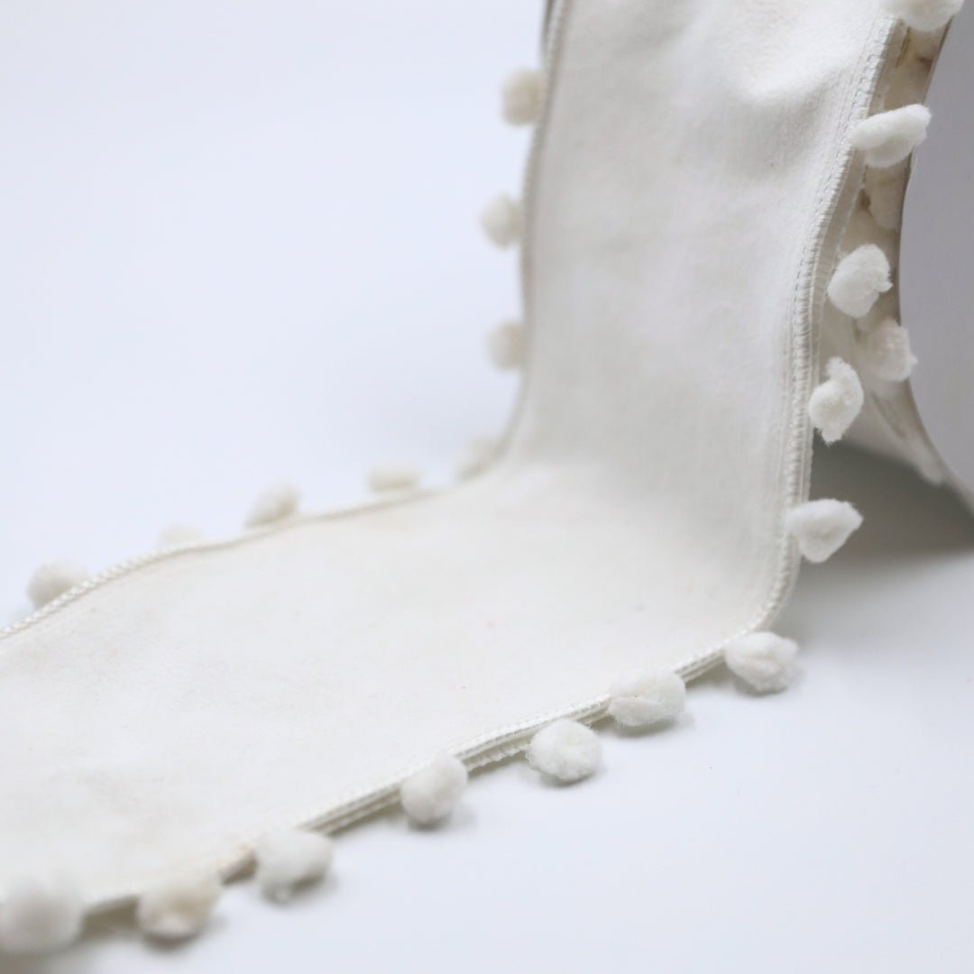 Add soft, playful charm to your festive decor with the White Dupion Ribbon, accented with delicate pom-pom edging. Crafted with wired edges for structured bows, it’s perfect for trees, garlands, wreaths, staircases, and gift wrapping.