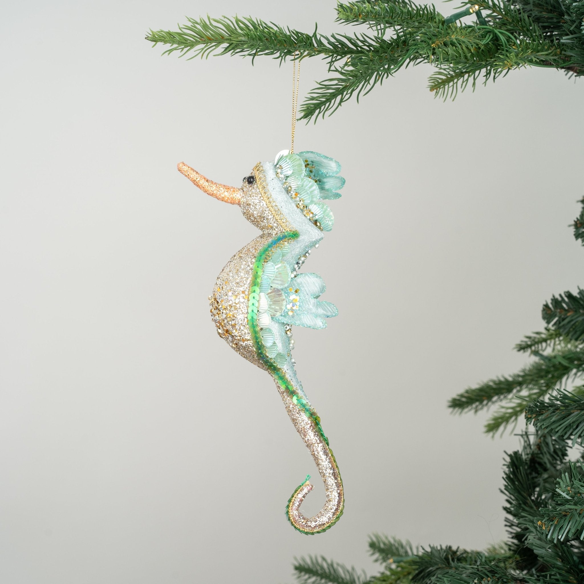 Embellish your holiday decor with our Aqua Glitter Seahorse Ornament. Made with premium platinum glitter, this exquisite piece captures the beauty of the sea in a sophisticated and exclusive way. The aqua color adds a touch of elegance and the glitter adds a subtle sparkle, making this ornament a must-have for any luxury holiday setting.