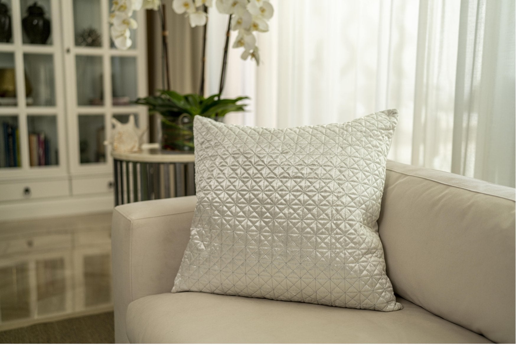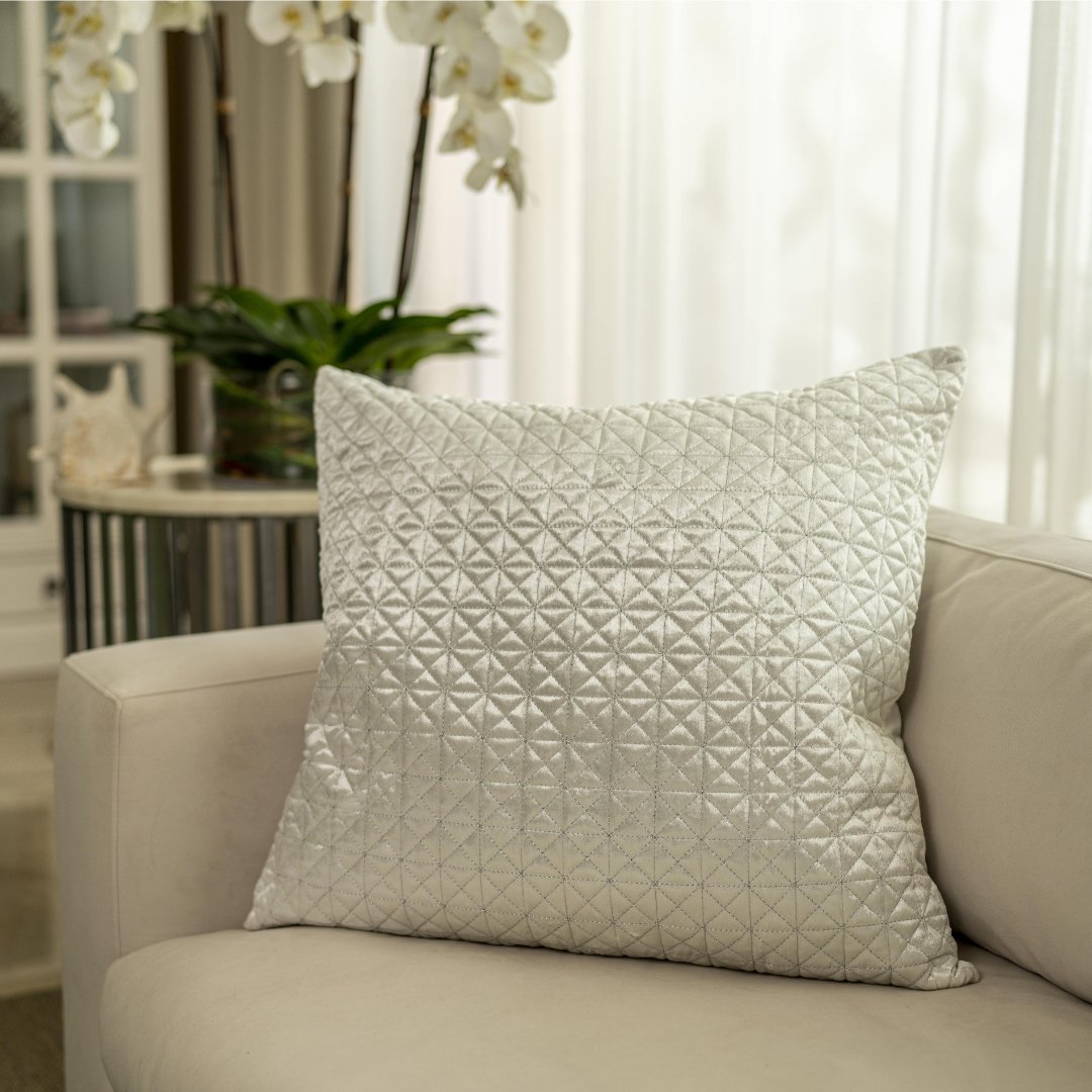 The Irony Home Hester cushion features hand-sewn metallic quilting on a plush ivory velvet canvas, in a stunning diamond-esque patterning.