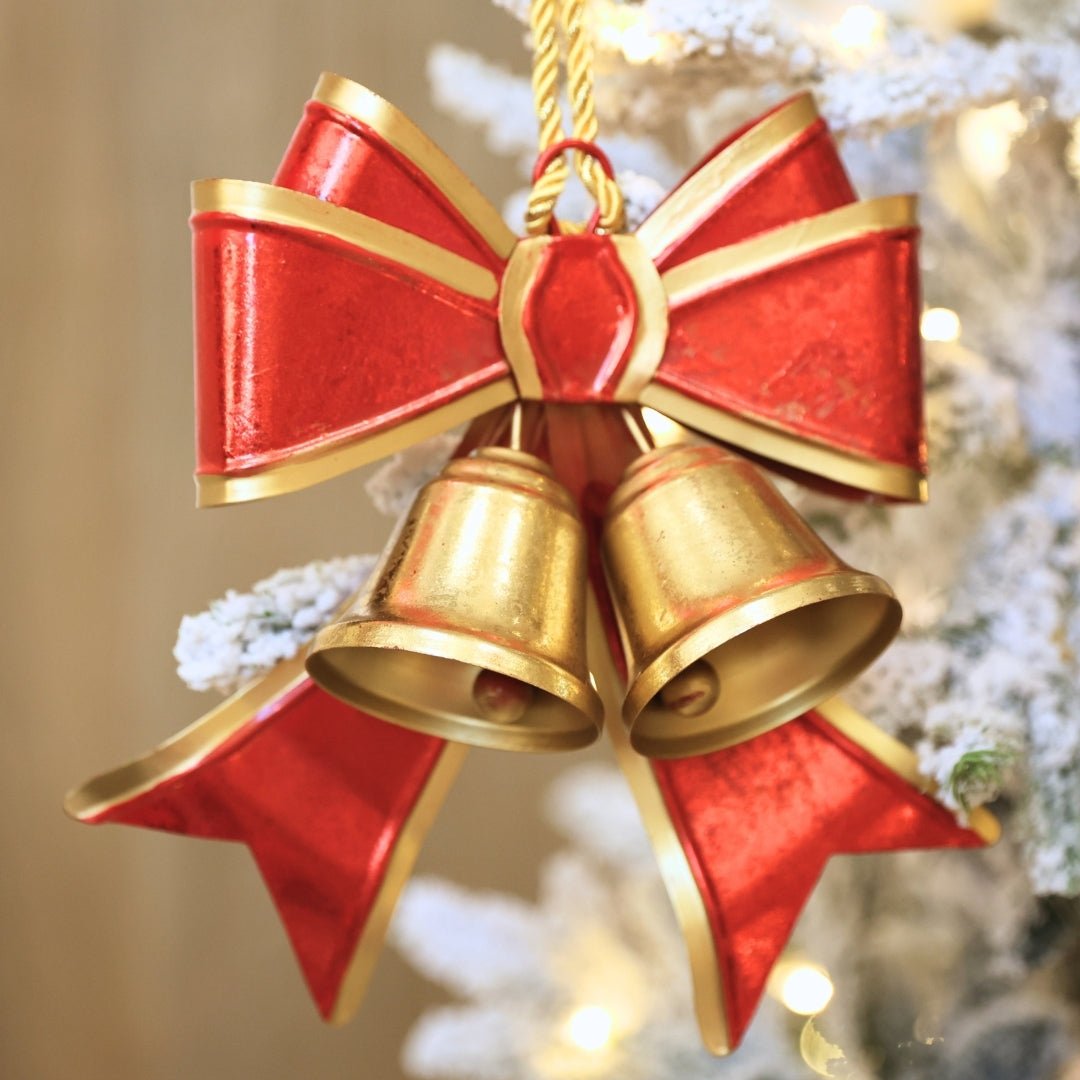 Celebrate the season with this elegant ornament from the Holiday Harmony Collection. Featuring a polished metallic bow paired with two petite hanging bells, it adds a refined touch of shimmer and soft chimes to any décor.
