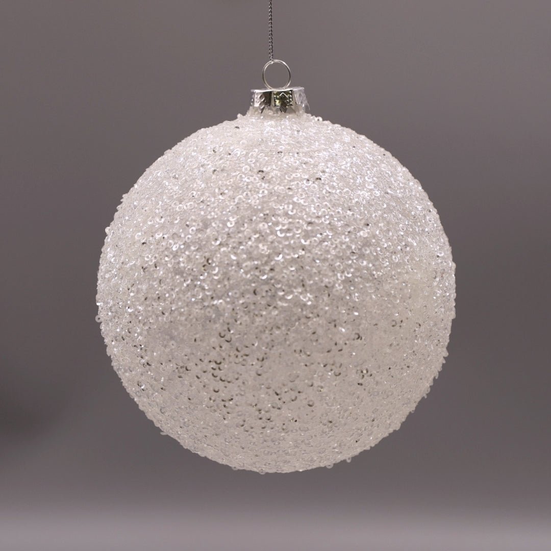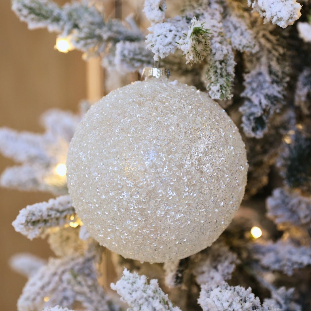 Illuminate your festive space with the shimmering elegance of our White Sequin Ball Ornament. Covered in iridescent sequins, it catches the light beautifully, adding sparkle and glamour to  seasonal displays. Perfect for luxury themed decor.