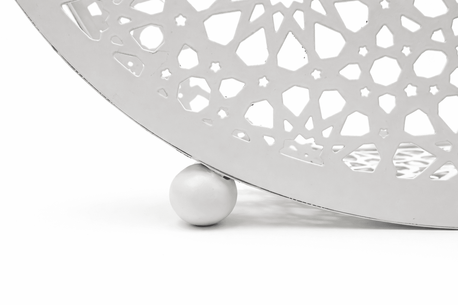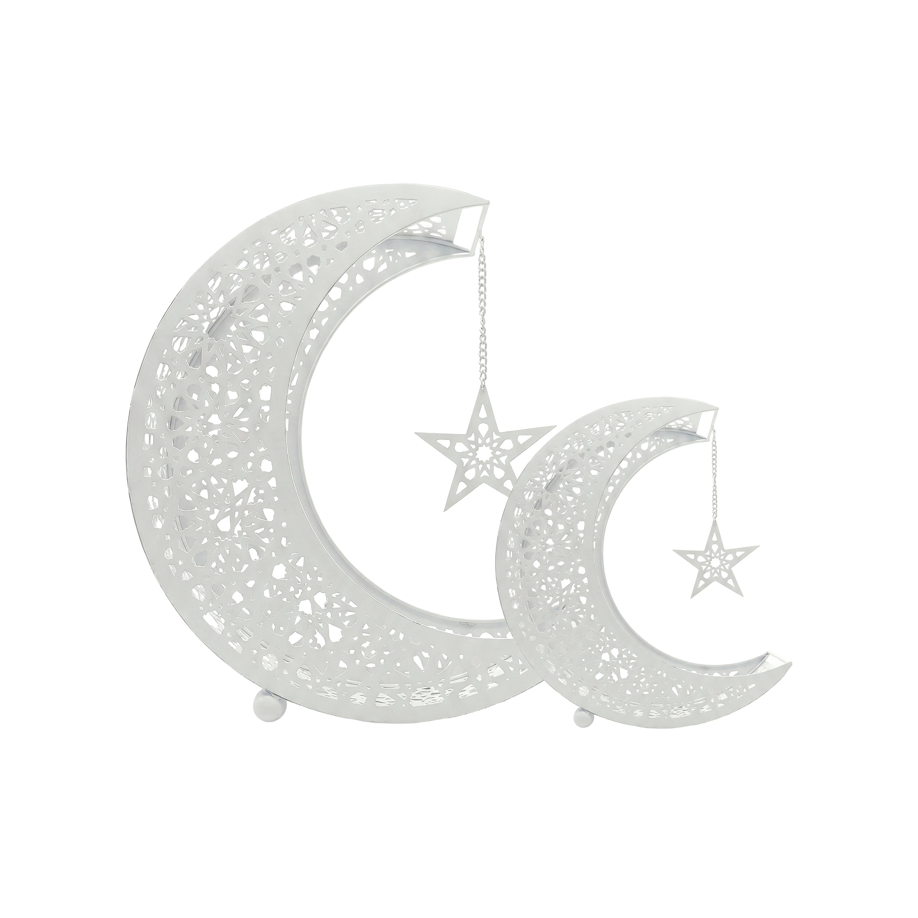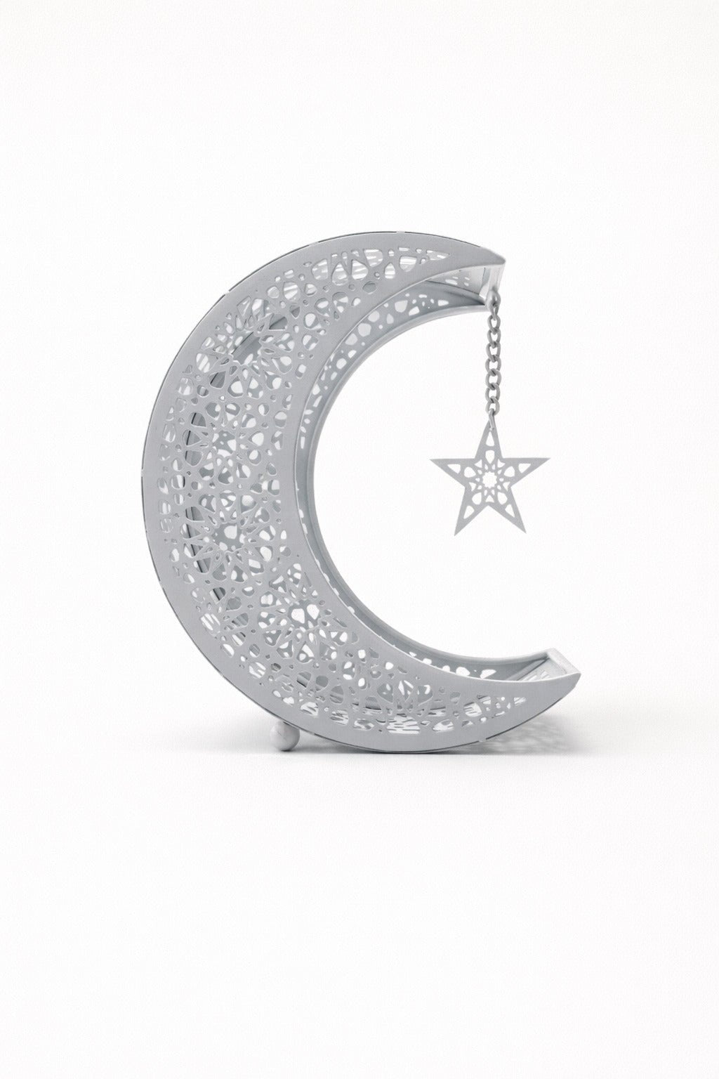A striking centrepiece crafted in a luminous white finish, the Classic Noor Elite Crescent brings elevated elegance to your Ramadan décor. Its intricate filigree metalwork and suspended star motif cast beautiful, ornamental shadows—creating a serene ambience of spirituality and luxury. Perfect for grand entryways, console tables, or statement Ramadan moments.