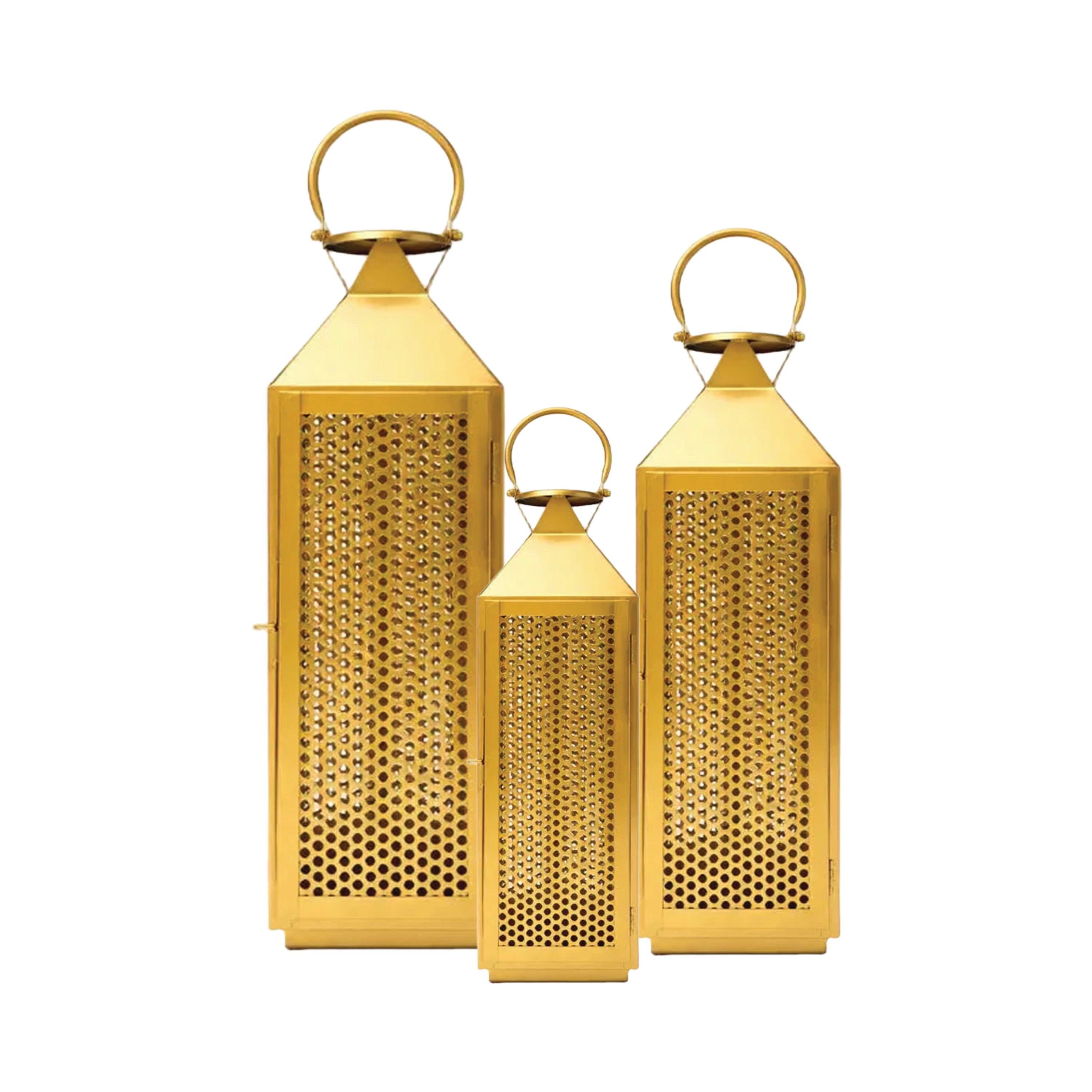 Elevate your décor with the exquisite warmth of our Gold Mesh Lantern Collection. Each lantern is crafted with a sleek pyramid top, intricate perforated mesh panels, and a woven-style ring handle — creating an elegant play of light that bathes your surroundings in a soft, golden glow.
