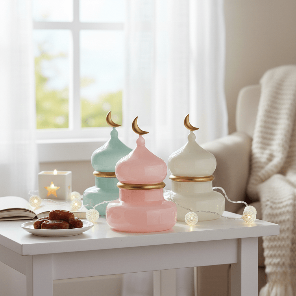 Designed to elevate festive styling, this decorative piece reflects light beautifully through its glossy glass finish, creating a serene and sophisticated ambiance. Perfect for display on console tables, coffee tables, or curated Ramadan settings, it works effortlessly as a standalone accent or layered with complementary décor.