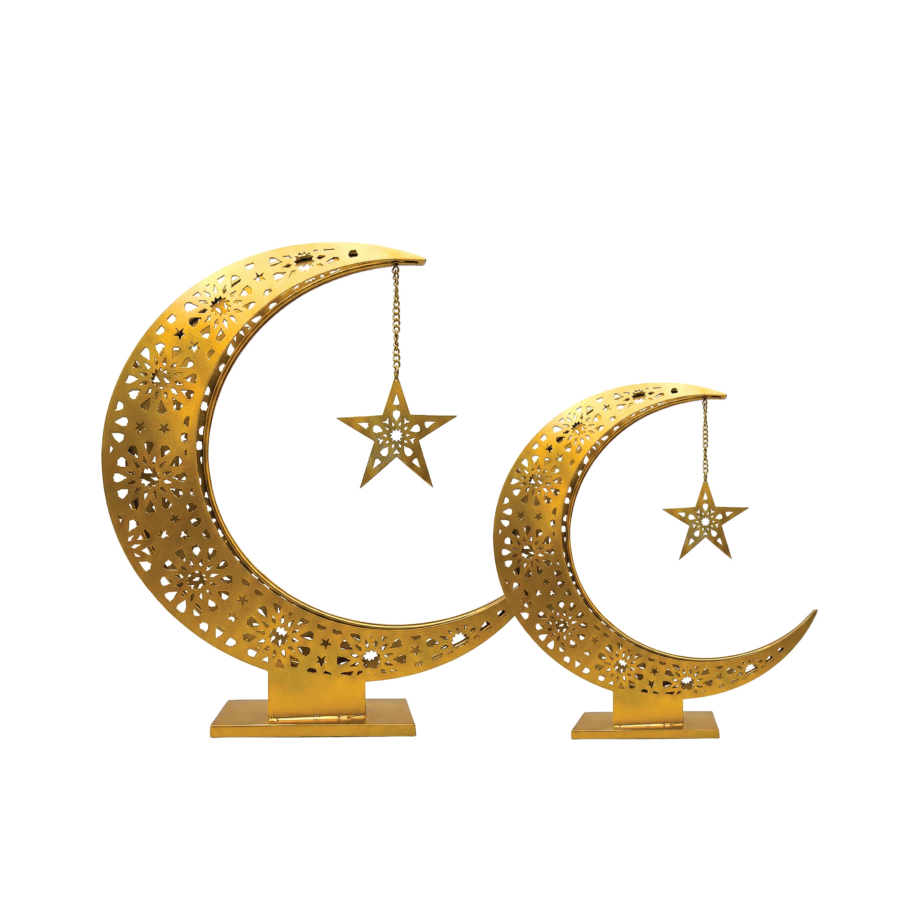 Bring an air of refined elegance to your Ramadan décor with the Large Ramadan Crescent Star Élite. Crafted with intricate filigree detailing and a gracefully suspended star, this statement piece captures the spiritual beauty of the holy season. The warm gold finish casts delicate patterns of light, creating an atmosphere of serenity and luxury. Perfect for mantels, consoles, entryways, and grand Ramadan centrepieces, it stands as a symbol of celebration, reflection, and elevated artistry.