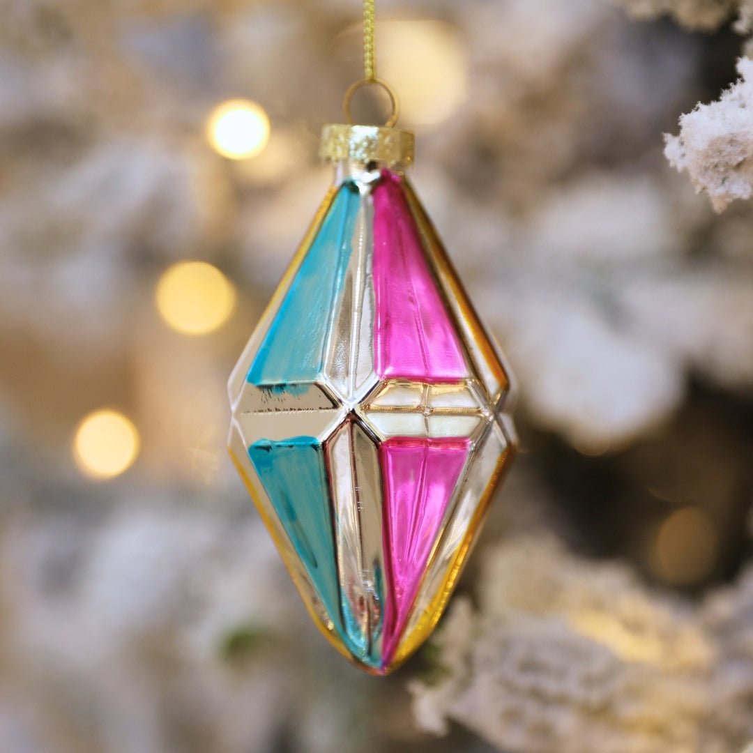 Add a touch of vintage charm to your festive décor with this retro-style multicolor shuttle ornament. Its ribbed glass and classic holiday hues bring nostalgic flair with a refined twist. The elongated shuttle shape adds visual contrast and catches the light beautifully from every angle.