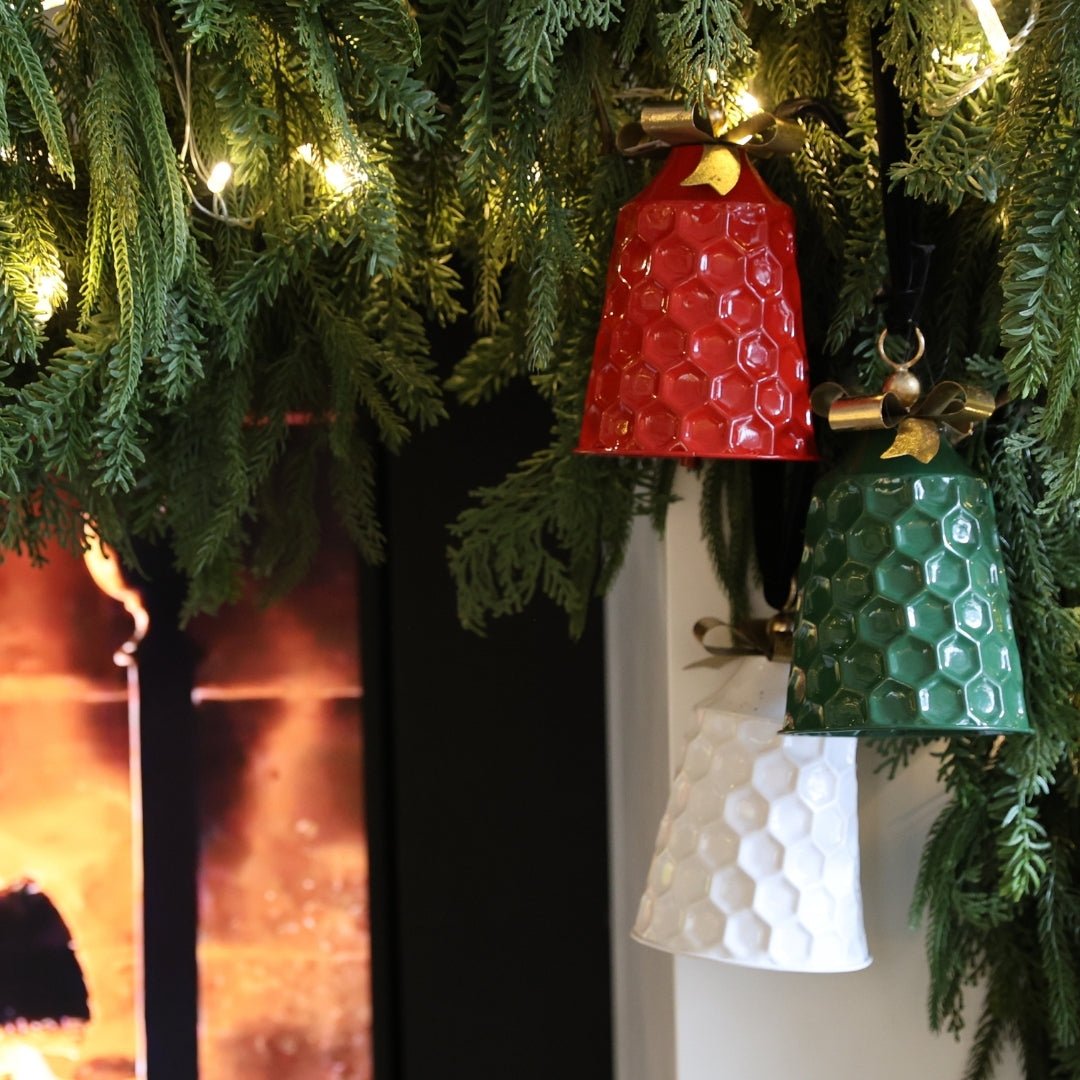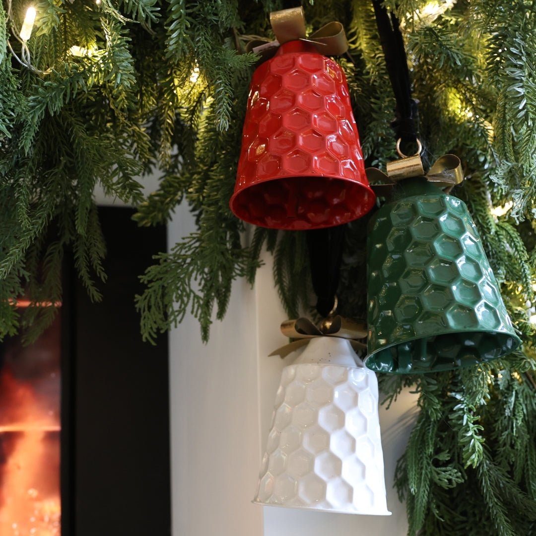 Infuse your holiday or year round decor with timeless charm using this trio of vintage style honeycomb iron bells. Expertly crafted with a weathered finish and honeycomb embossing, each bell adds character and melodic allure to your space. Display on a door handle, wreath, tree, or mantel for nostalgic artisanal elegance.