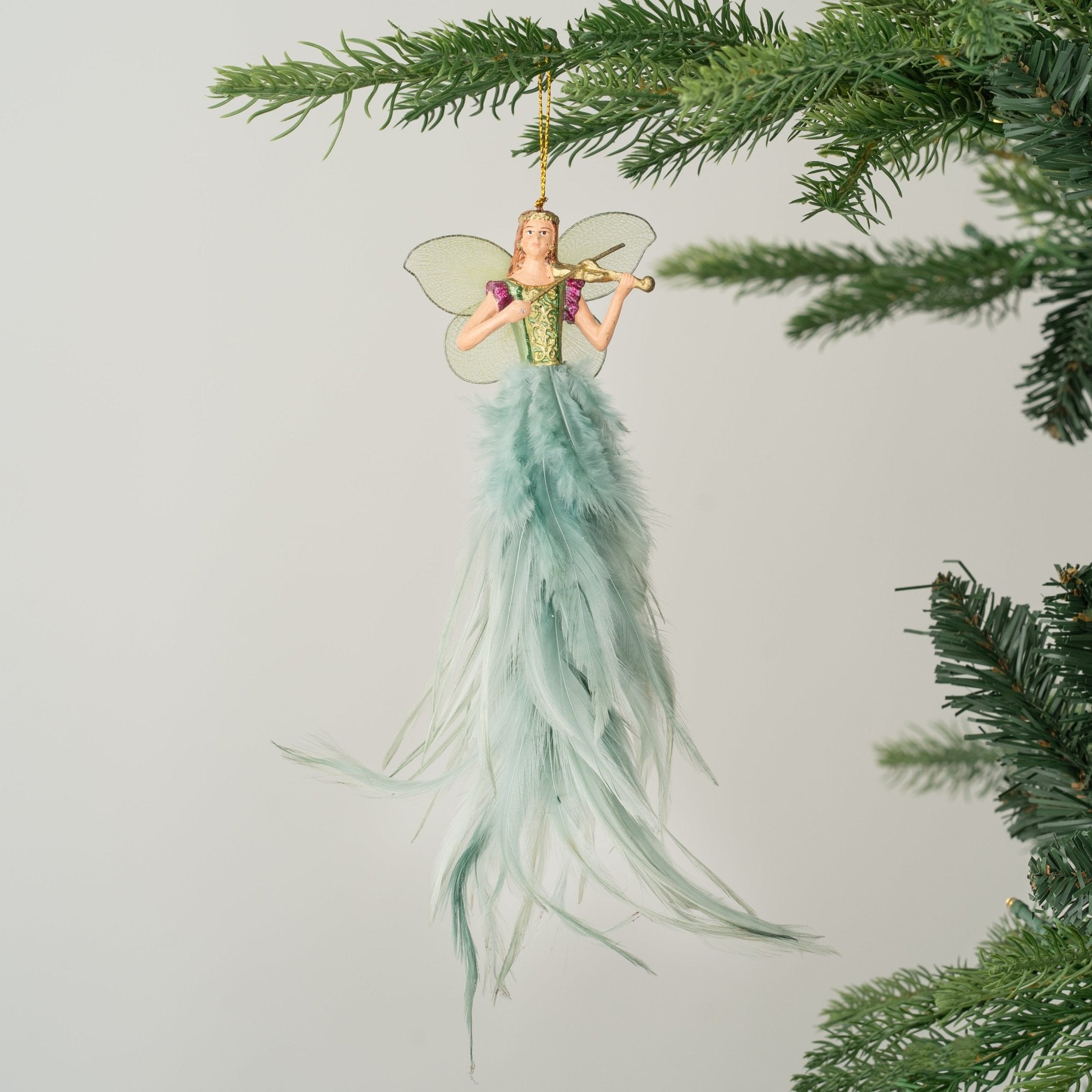 Bring elegance and sophistication to your home with this remarkable Mint Feather Skirt Fairy Ornament. Each fairy is beautifully crafted with graceful wings and an intricate skirt of fine feathers, making it a charming addition to any decor. Perfect for adding a touch of luxury to your holiday season.