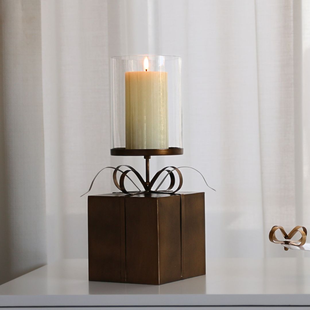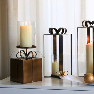 Timeless elegance meets sculptural charm in our Gold Tarnish Bow-Tie Hurricane Candleholder; a refined statement piece crafted from iron and glass with a graceful, weathered gold finish.