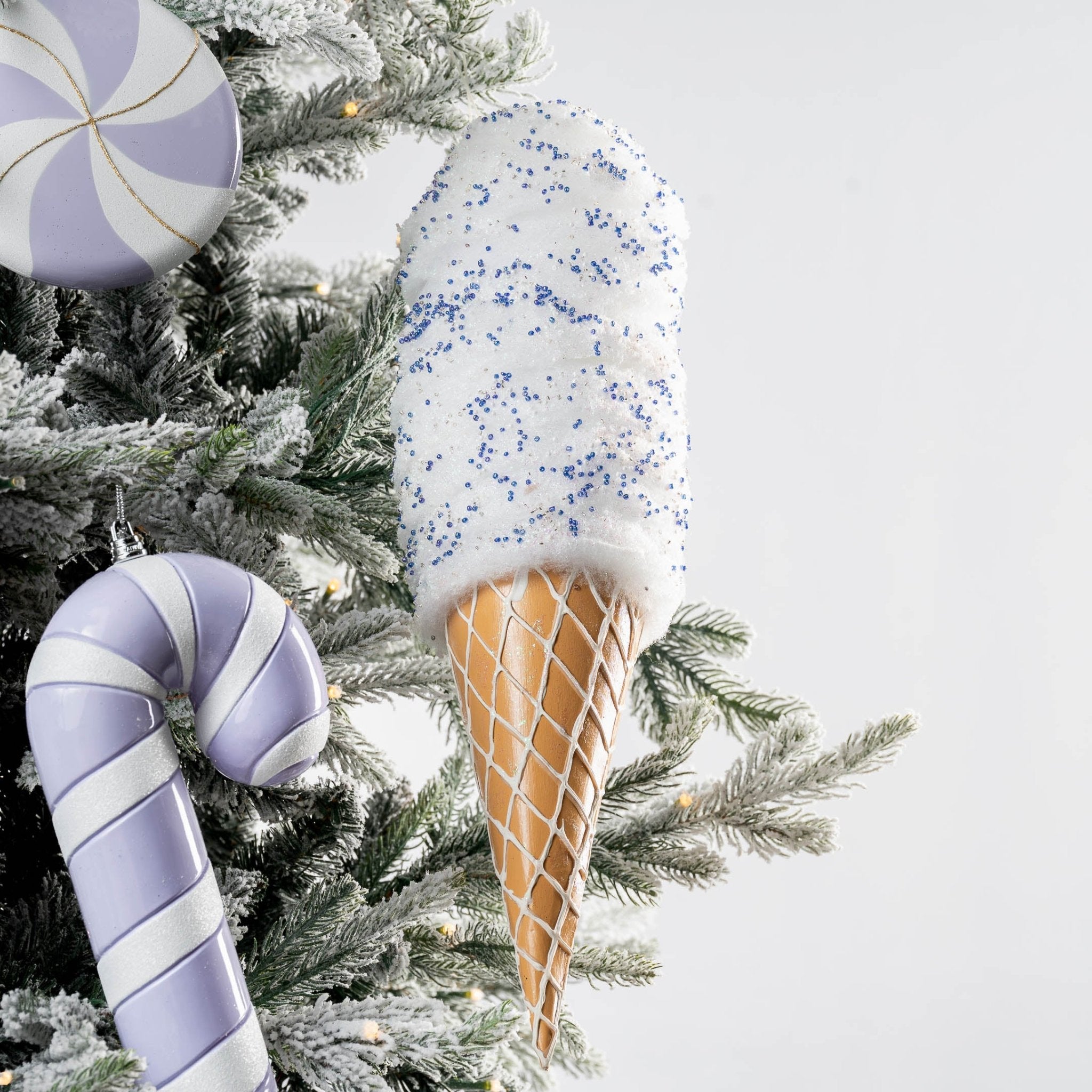 Add a whimsical touch to your holiday decor with this ice cream cone ornament. Adorned with glittery detailing and soft pastel hues, it’s perfect for candy themed trees, festive kids displays, or playful holiday arrangements.