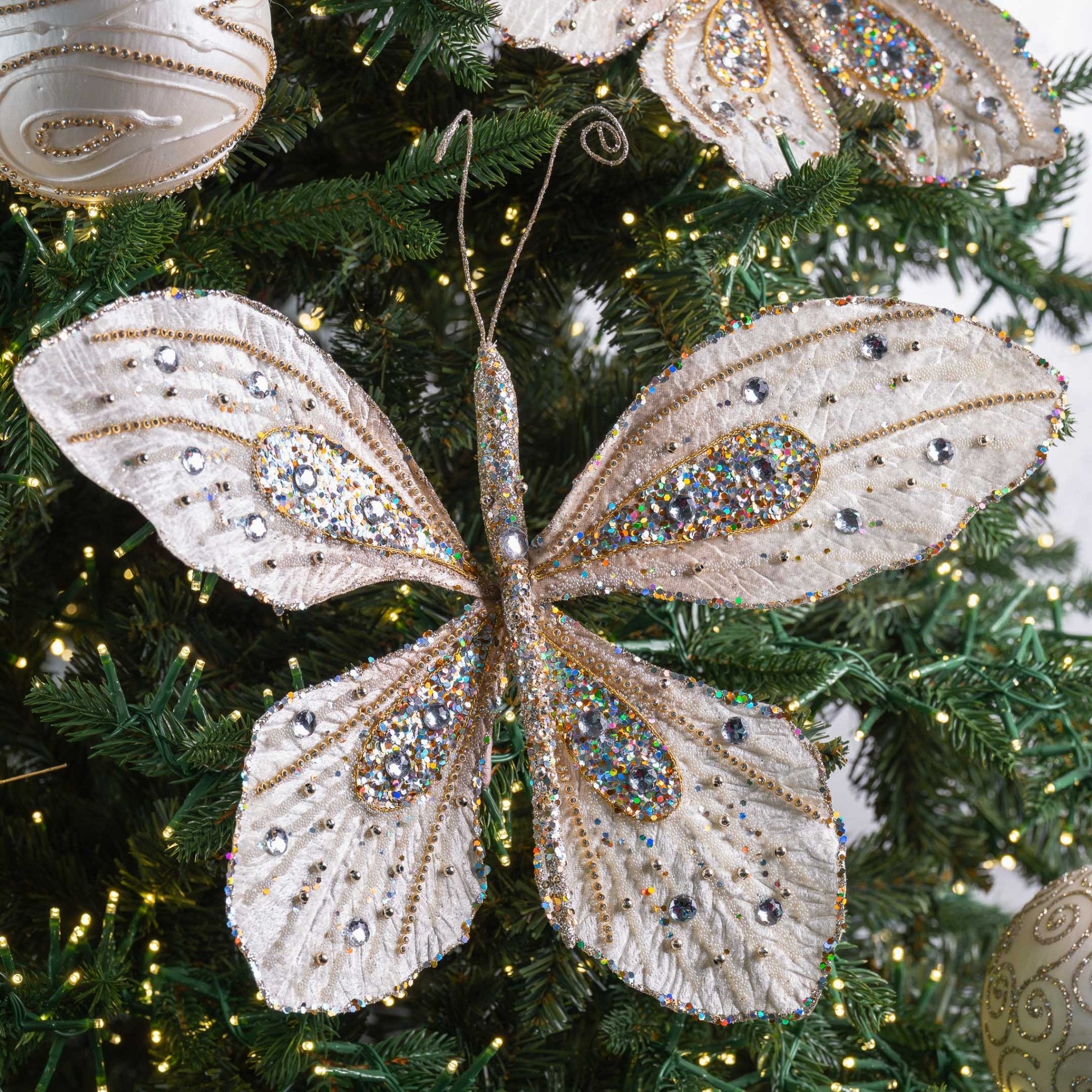 A luxurious velvet butterfly clip, accented with radiant starburst details, adds both sophistication and whimsy to your holiday décor. Made with soft velvet and shimmering embellishments, this clip-on ornament is easy to style and available in two sizes.