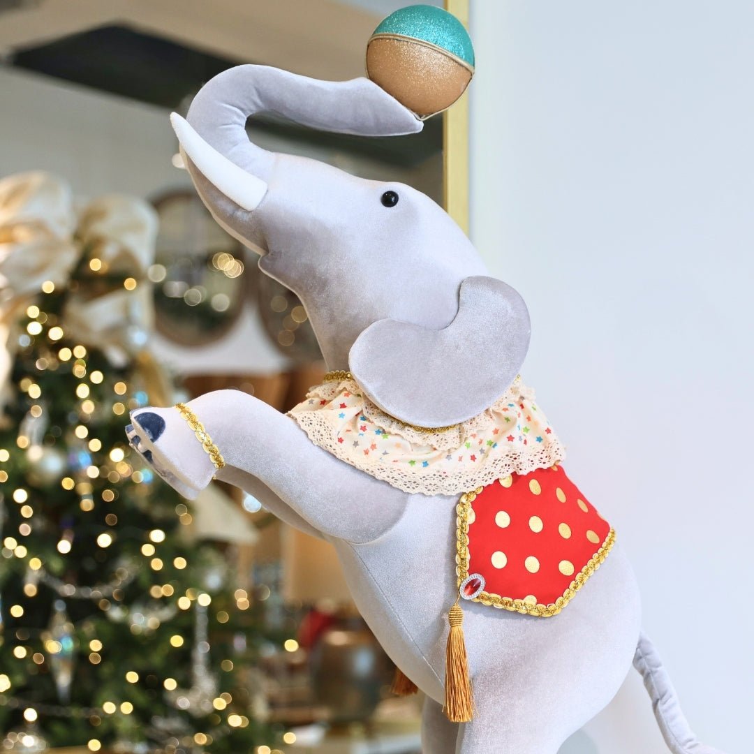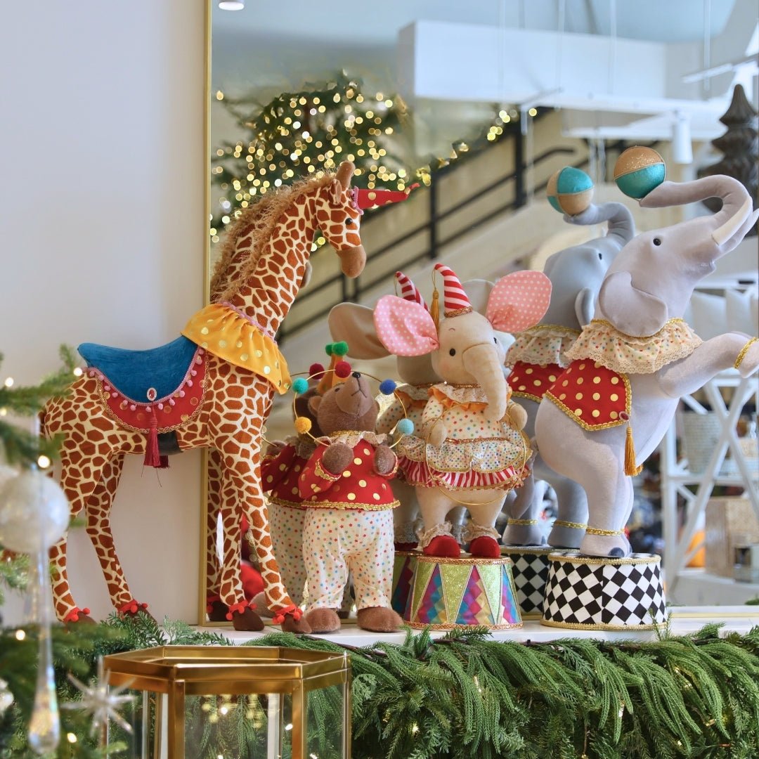 A striking nod to vintage circus flair, this elephant stands with quiet confidence and charm. Its bold black and white base adds a dramatic touch to any festive arrangement. Beautifully detailed with painted features and expressive posture, and elevated on a classic striped base, it’s ideal for eclectic holiday displays .