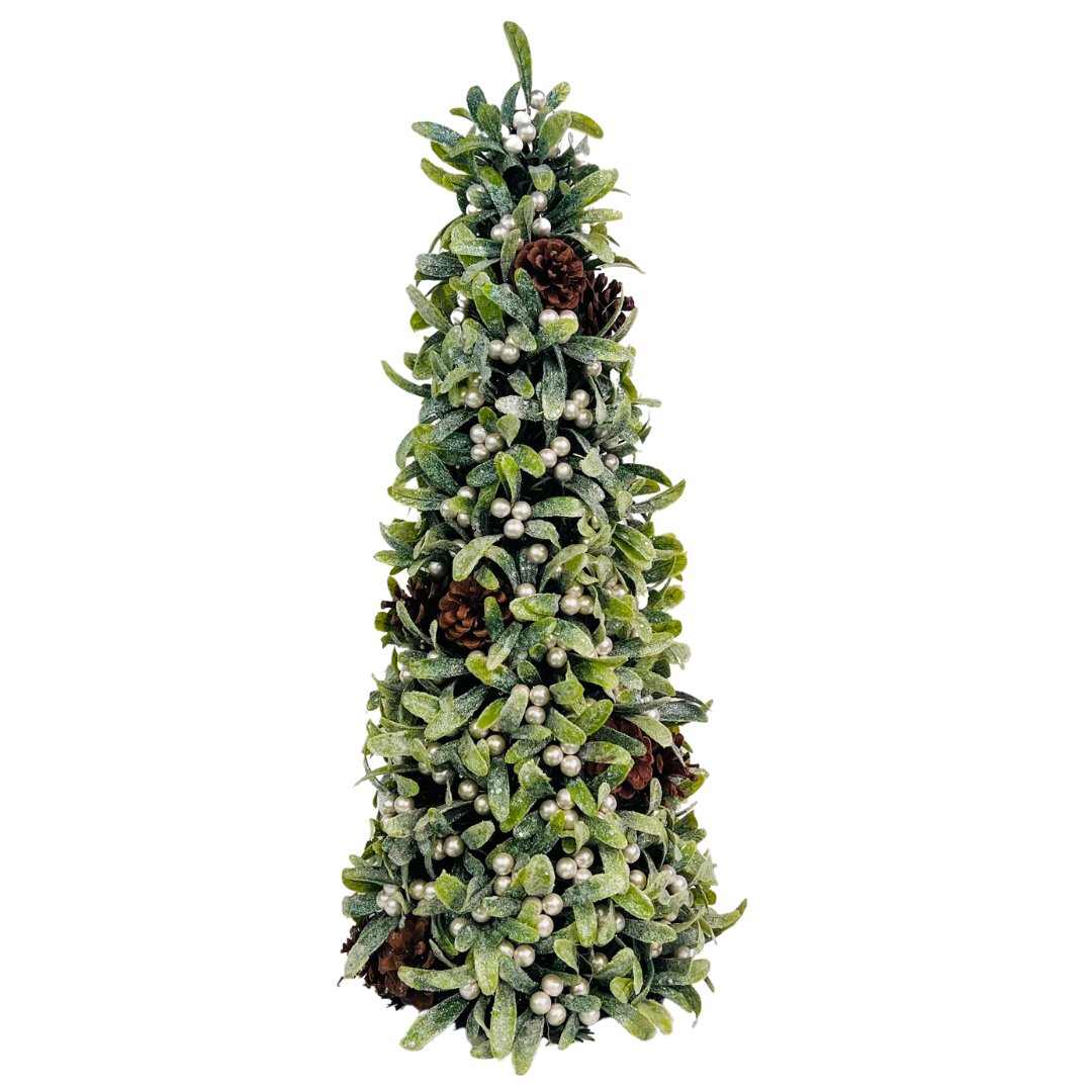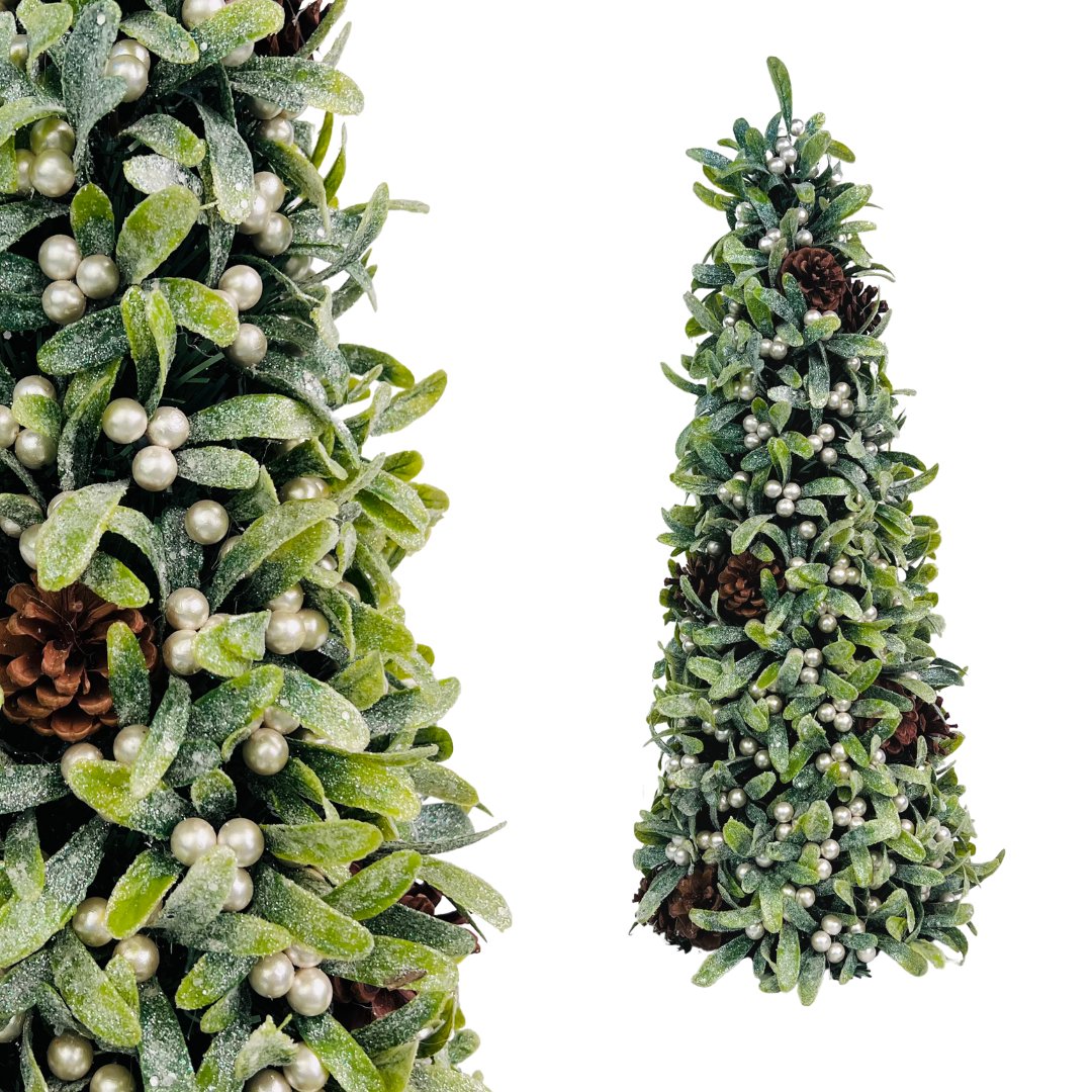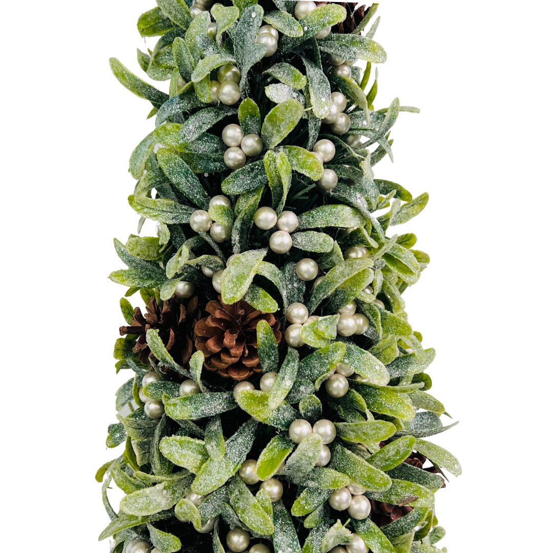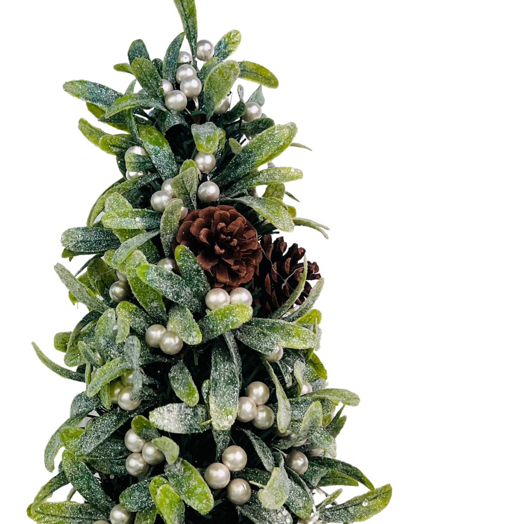 A classic Glitter Mistletoe Table Top with paired pinecone accents, perfect as a centerpiece for your dinner table, a warm festive touch on your mantel, or a charming addition to your entryway.