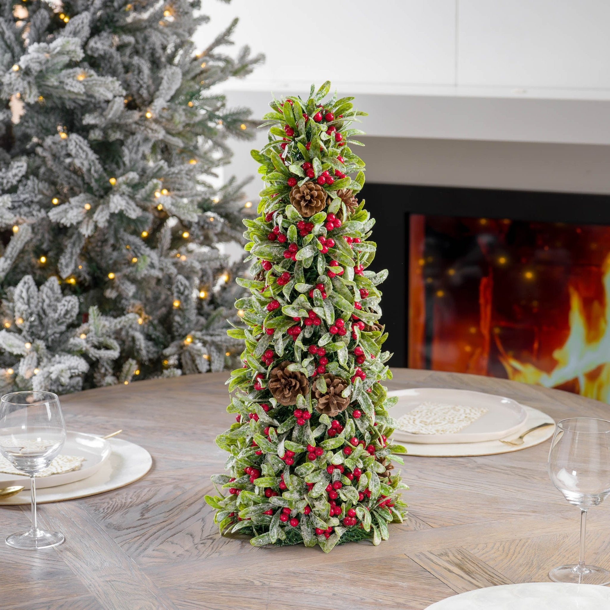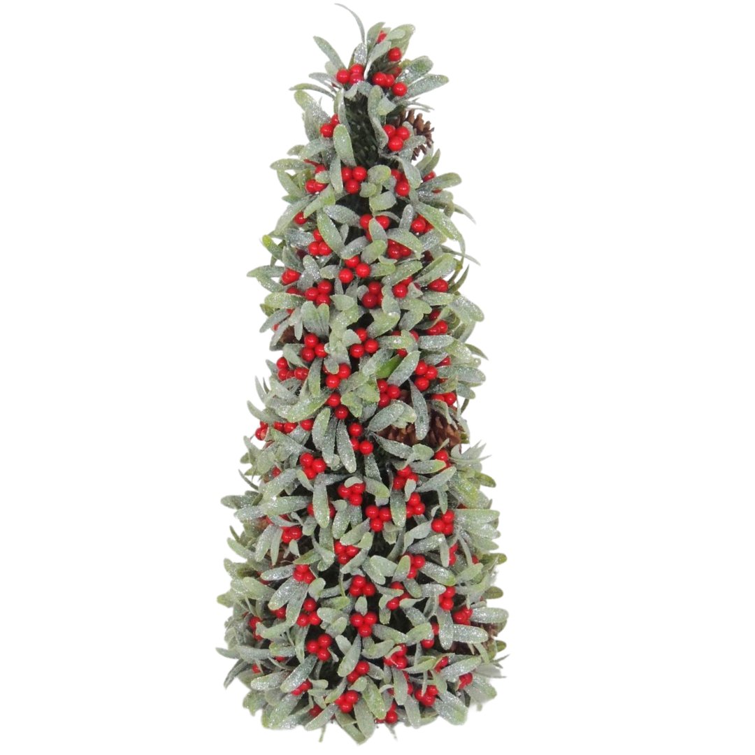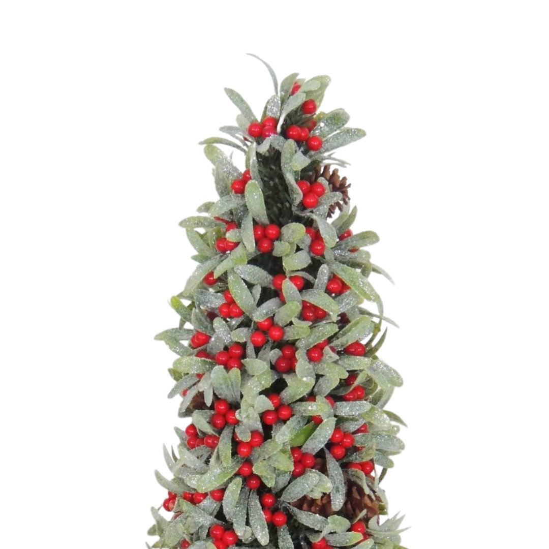 A classic and traditional Conical Glitter Mistletoe Table Top with Red Winterberry accents that will make the perfect centerpiece to your dinner table, add a warm festive nuance set atop your mantel, and can also be added to your entryway this festive season.