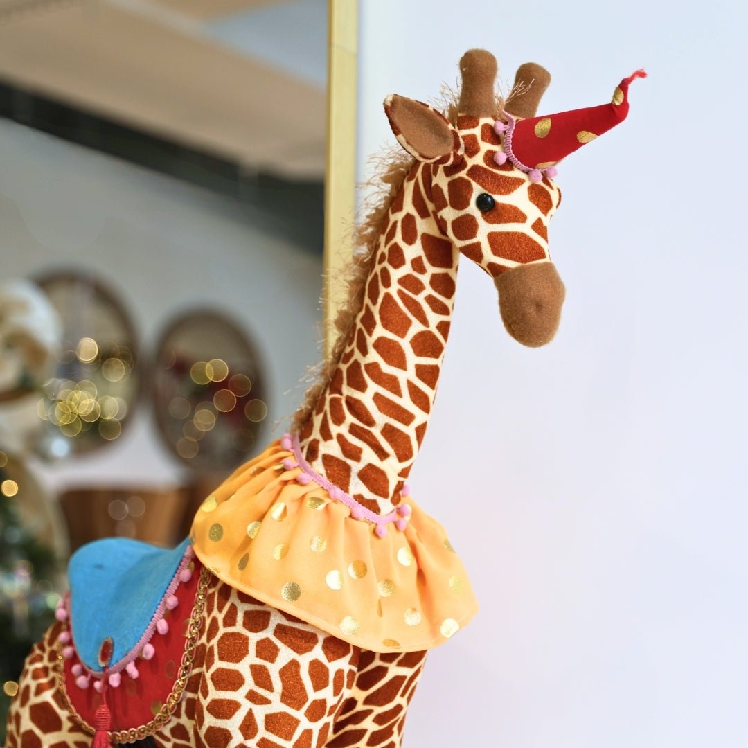 This tall charmer steps straight out of a magical circus scene. Dressed in a playful costume, the giraffe adds personality and color to your decor. It’s perfect for consoles, kids spaces, or eclectic holiday displays.