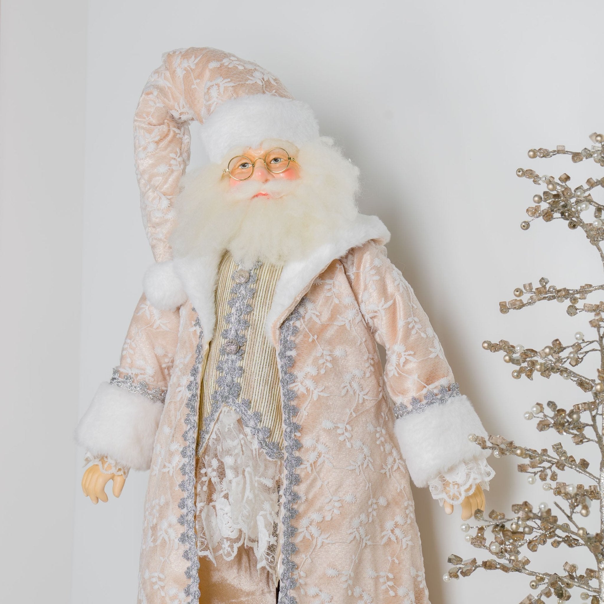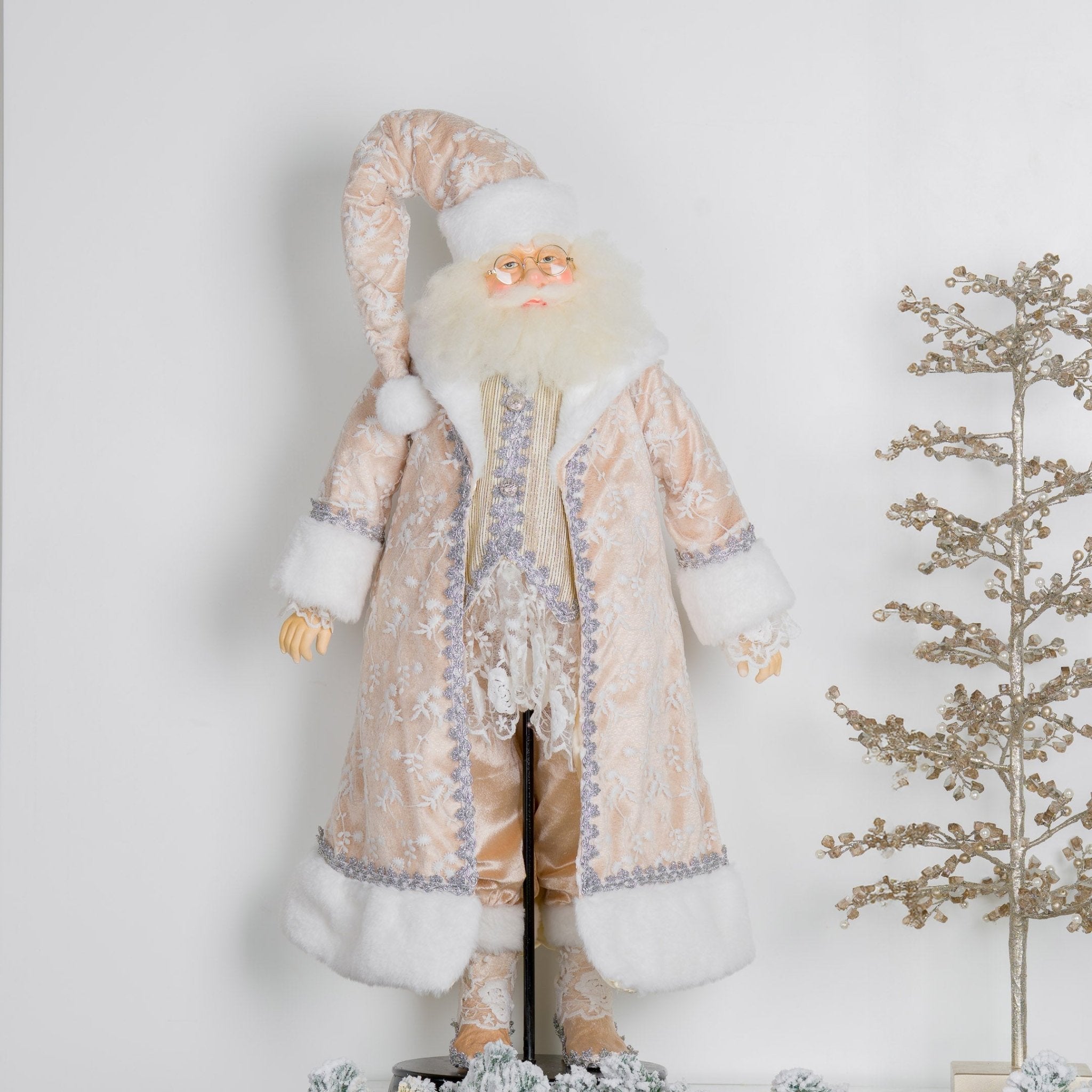 Understated charm meets timeless tradition with this Light Taupe Santa, radiating calm elegance. Styled in soft taupe and elevated on a sleek black stand, it adds neutral toned sophistication to entryways, corners, or refined holiday displays.
