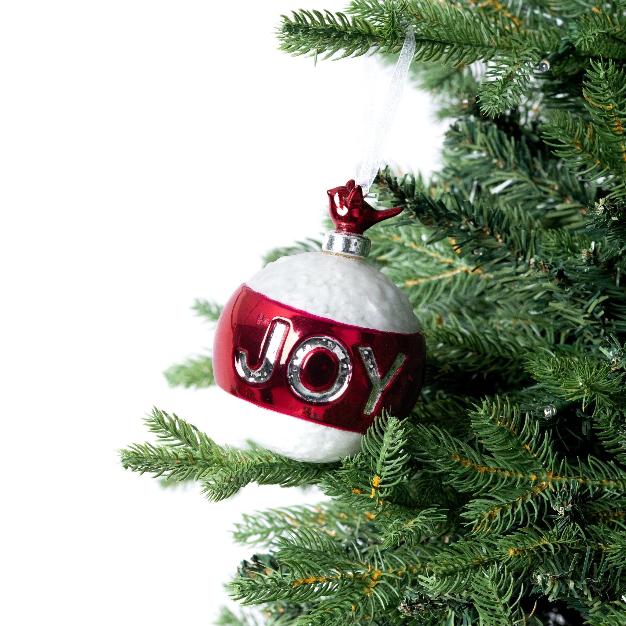 Add some festive cheer to your holiday decor with our Red & Silver Bird Top Ball Ornament. With intricate detailing and a touch of glitter, this elegant ornament will add a touch of whimsy to your tree. The "JOY" inscription serves as a reminder of the true meaning of the season.