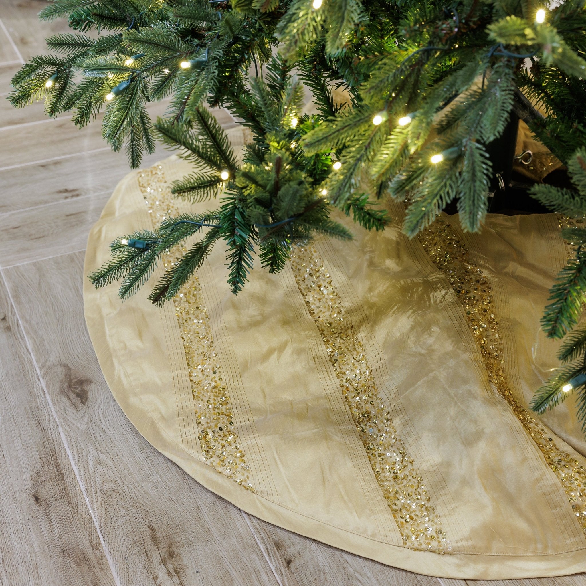 A glamorous and shimmering Classic Gold Dupion Tree Skirt with Pintak Embroidery on the tree skirt border. For creating a special place under the Christmas tree where you can stock all your gifts, this Christmas tree skirt is a beautiful addition to your festive decorations.