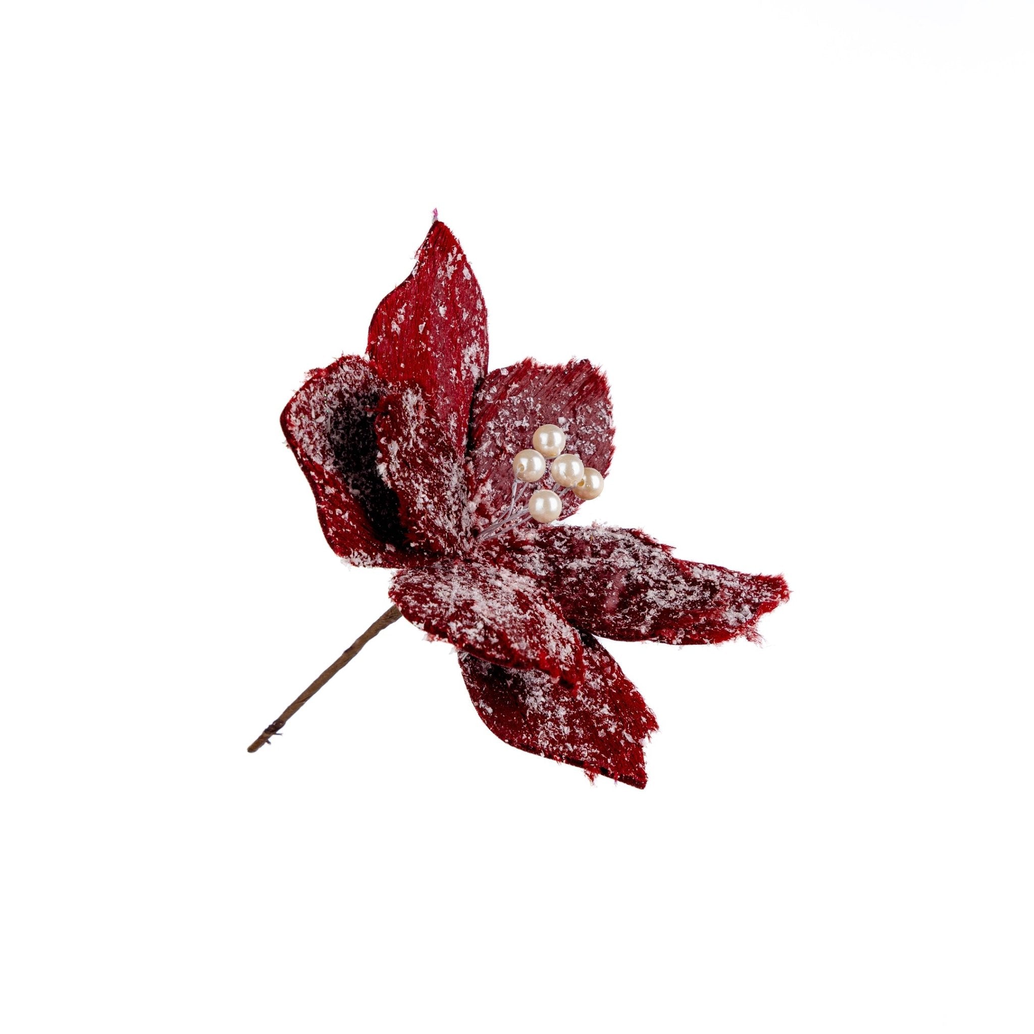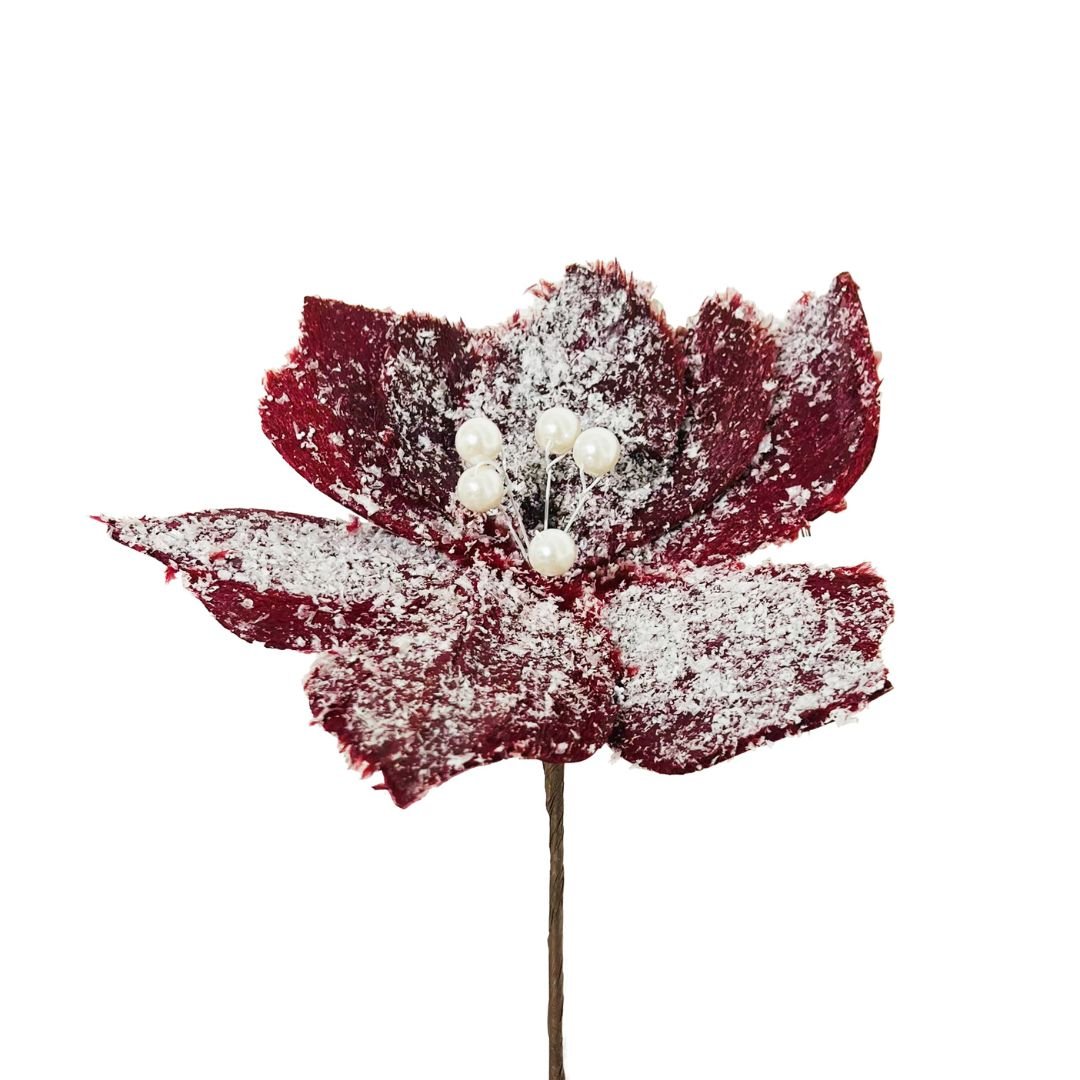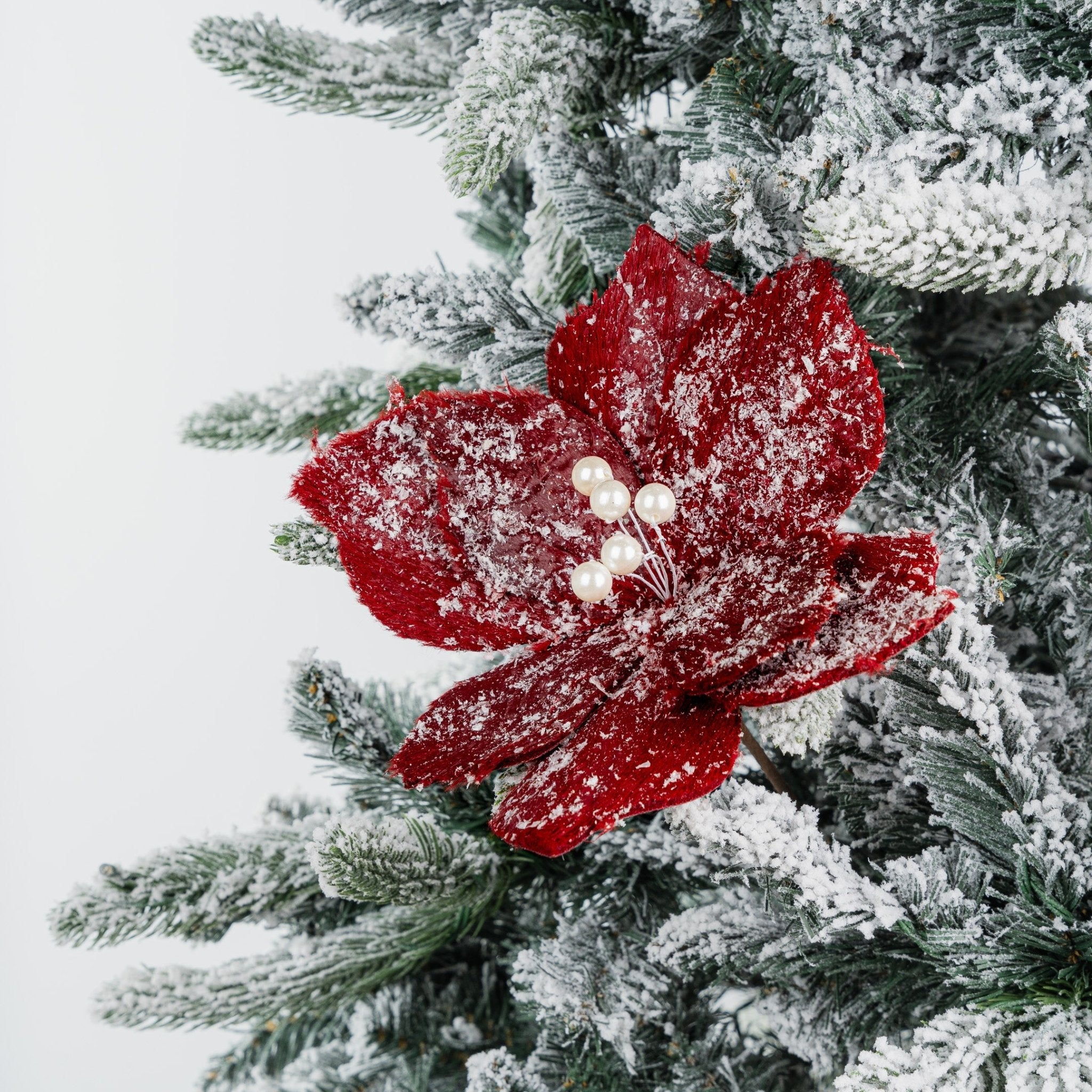 Add a festive touch to your holiday décor with this Flocked Red Flower Christmas Tree Pick. Its vibrant red blooms and snowy flocking bring a charming, wintry elegance to any Christmas tree or wreath. Perfect for enhancing your seasonal arrangements, this pick adds color and texture that capture the spirit of the holidays with effortless style.