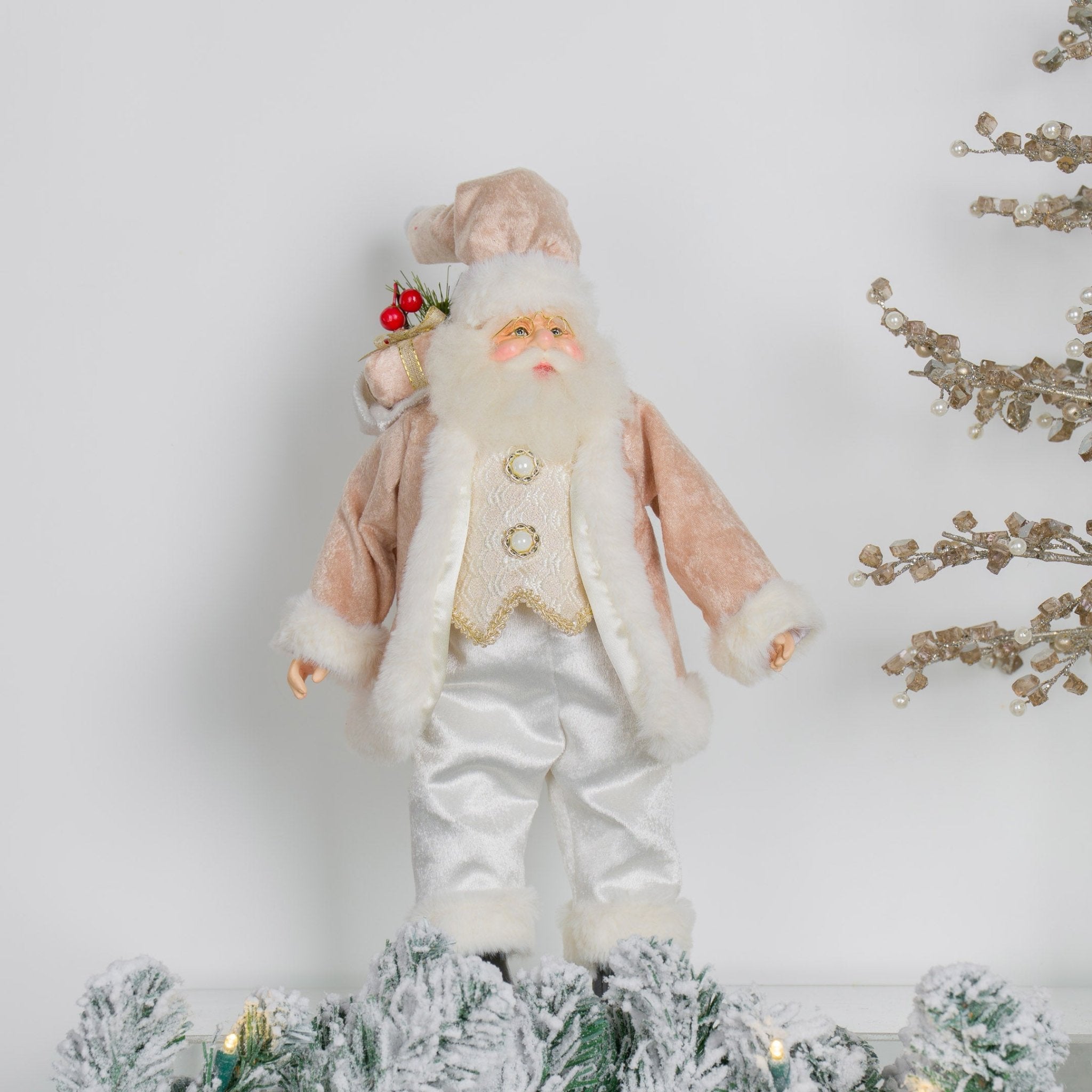 Wrapped in shimmering champagne tones, this standing Santa exudes refined holiday charm. With elegant detailing and delicate trimmings, he stands tall as a graceful centerpiece or mantel accent, bringing understated luxury and timeless warmth to any festive decor.