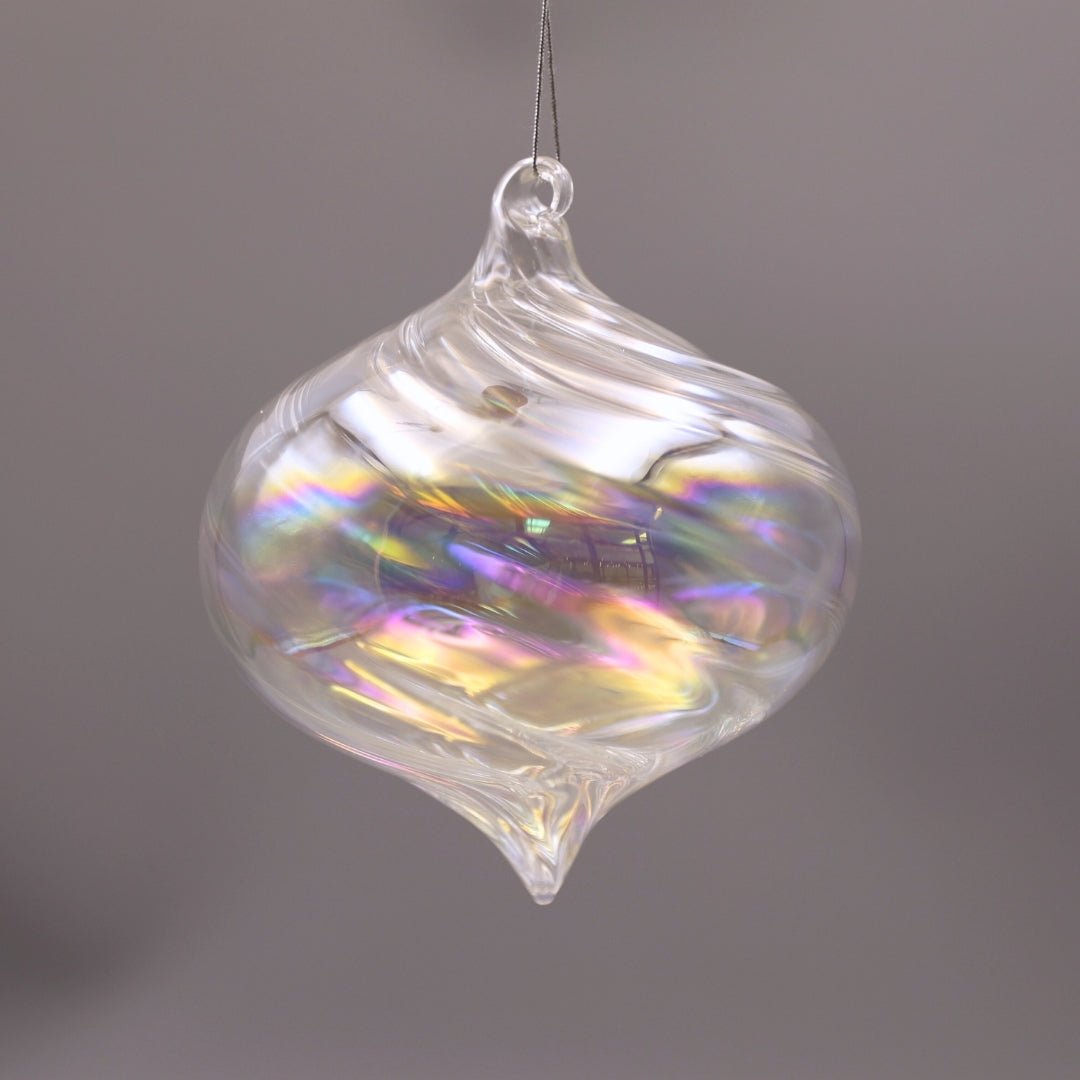 Radiant and refined, this ribbed onion finial ornament features a luminous iridescent finish that shifts with the light, bringing depth and elegance to trees, garlands, or centerpieces. Ideal for pairing with silver, crystal, or pearl decor.