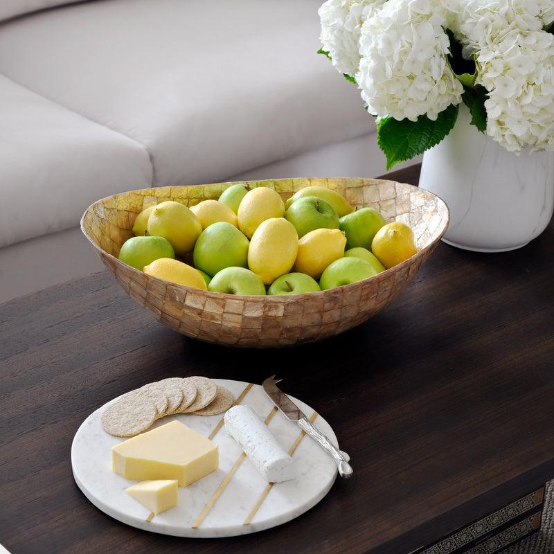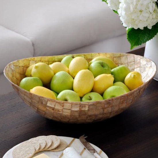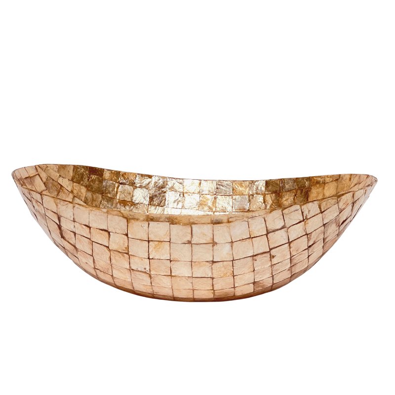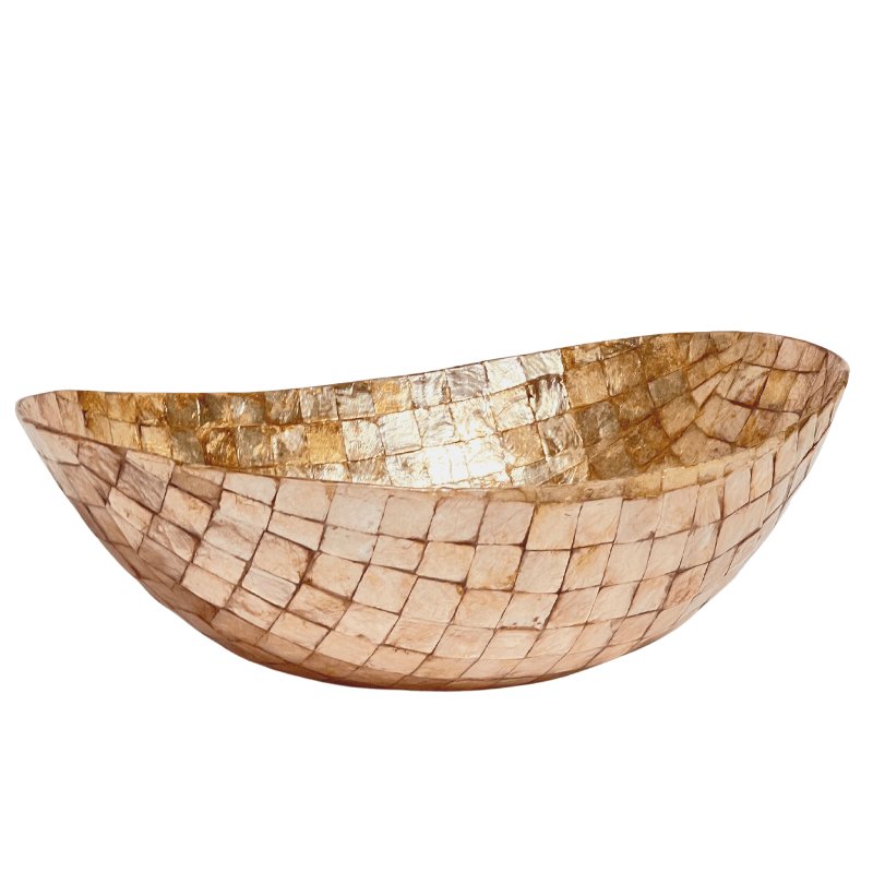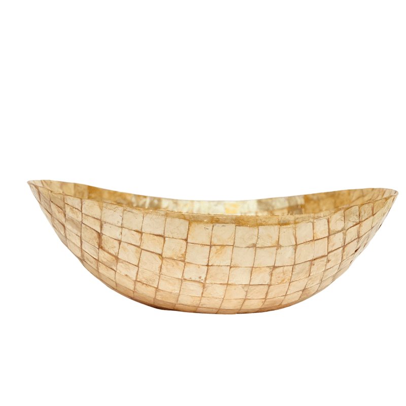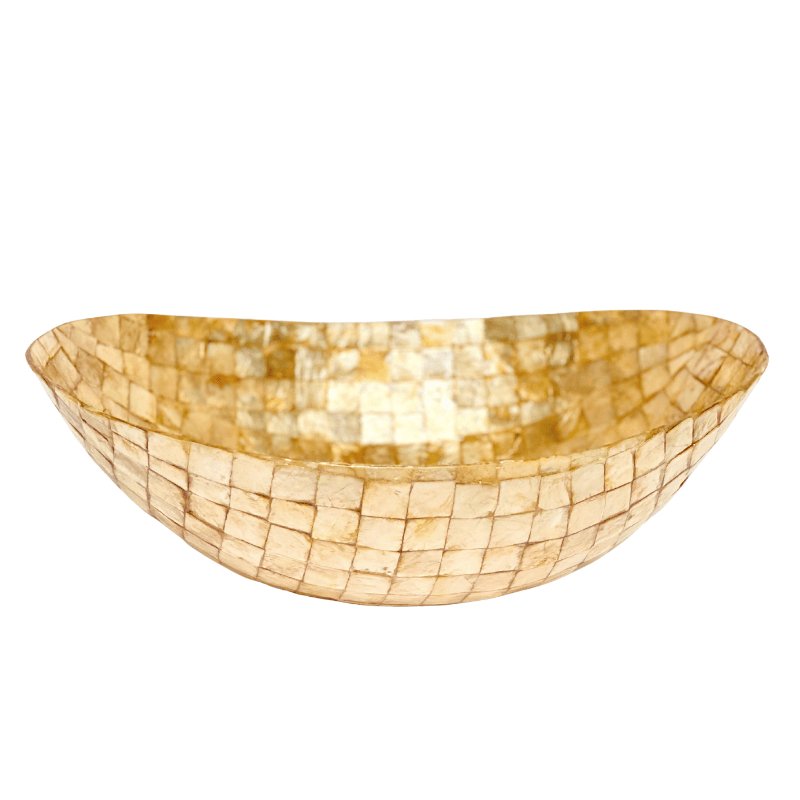 Fine-cut mosaic seashell, handcrafted to meld traditional mosaic crafts with innovative design in an unequaled gold finish. Fill with fresh botanicals, and aromatic potpourri, or let this beautiful shell boat steal the spotlight on a tabletop or on a shelf.