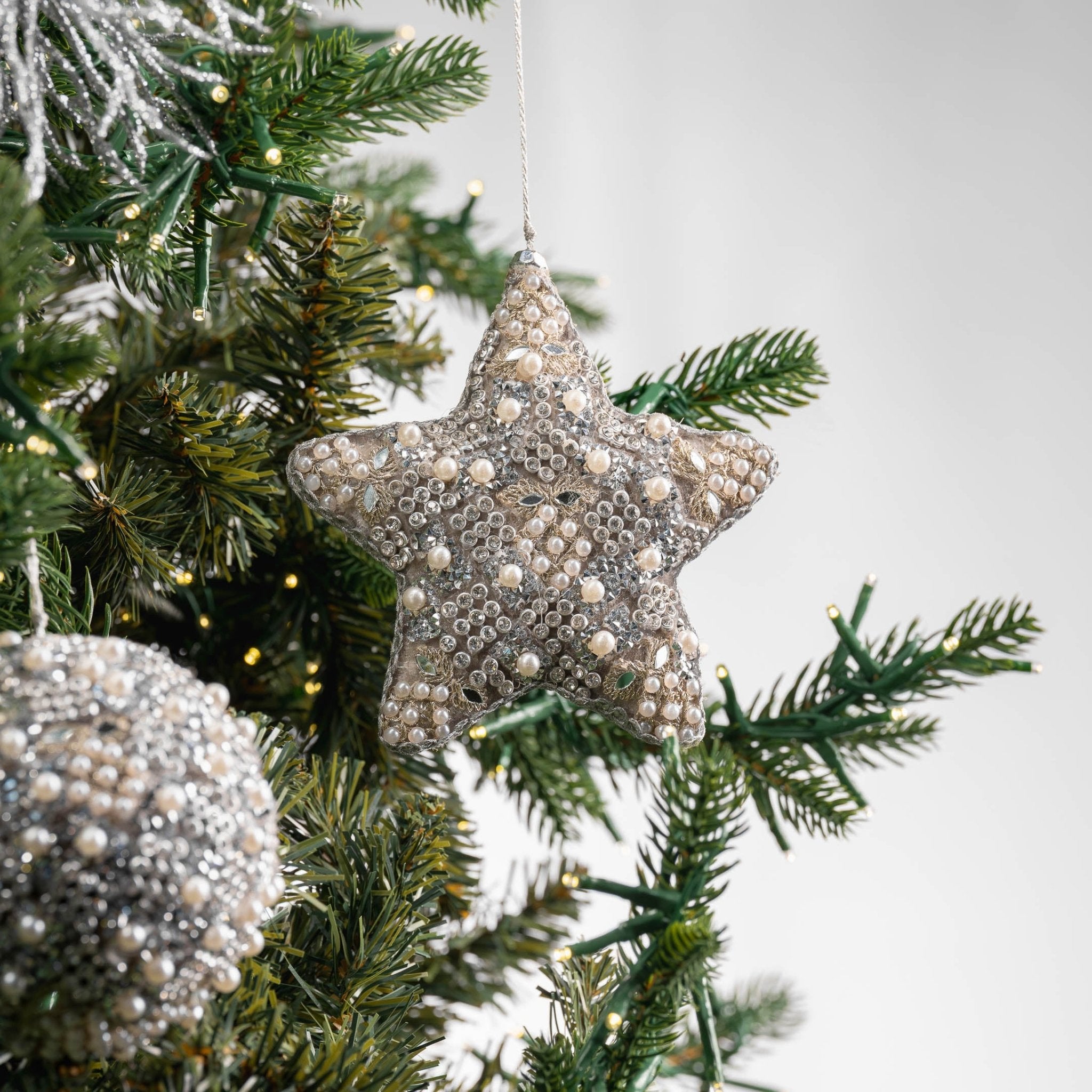 A graceful star ornament adorned with shimmering crystals and classic pearls, designed to add refined sparkle to your holiday décor. Embellished with delicate pearl and crystal details, it radiates festive elegance and serves as a timeless addition to luxury Christmas displays.
