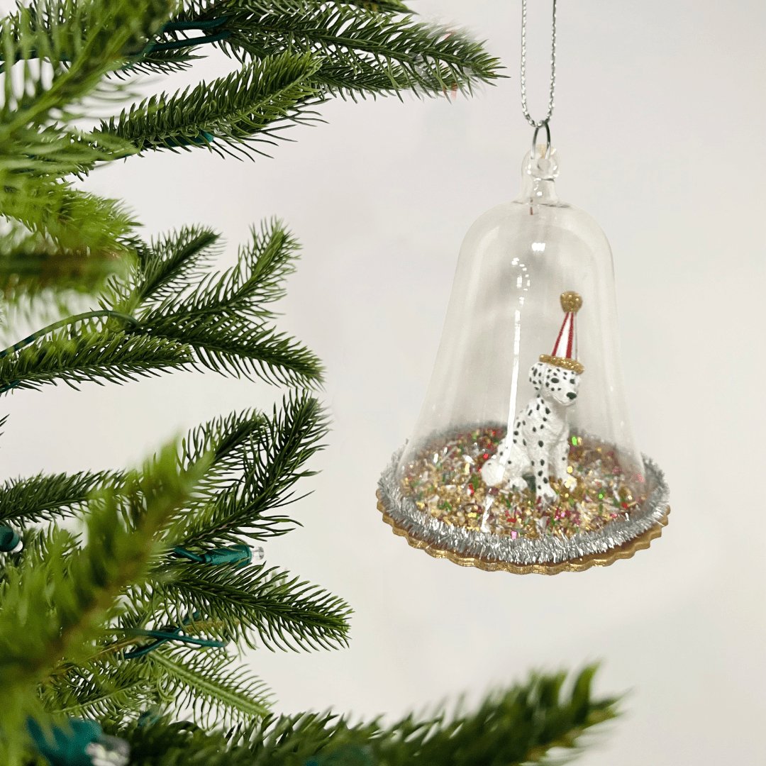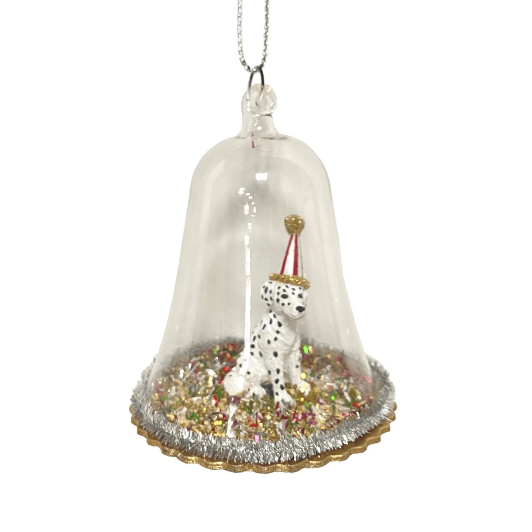 An artistically crafted festive masterpiece, this hand-blown glass cloche Christmas tree ornament, with an adorable Dalmatian puppy with a festive party hat figurine inside, is just the conversation piece to add to your Christmas decorations this festive season. With sparkling gold glitter fractals inside, add this cloche ornament to your Christmas tree for that touch of glamour!