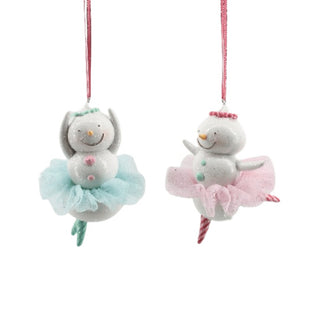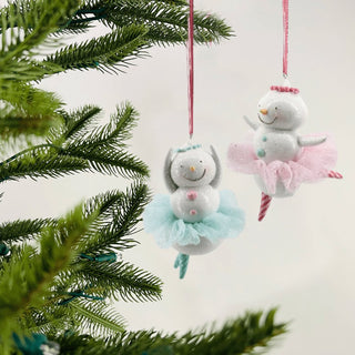 As adorable as can get, this set of two snowman ballerinas with tulle skirts in powder blue and pastel pink hues is a cute addition to your festive decorations this Christmas season. These dancing ballerina snowman Christmas tree ornaments add magic to your celebration and are the perfect fit for both outdoor and indoor trees.