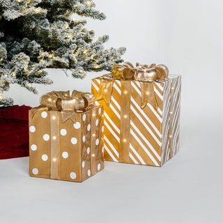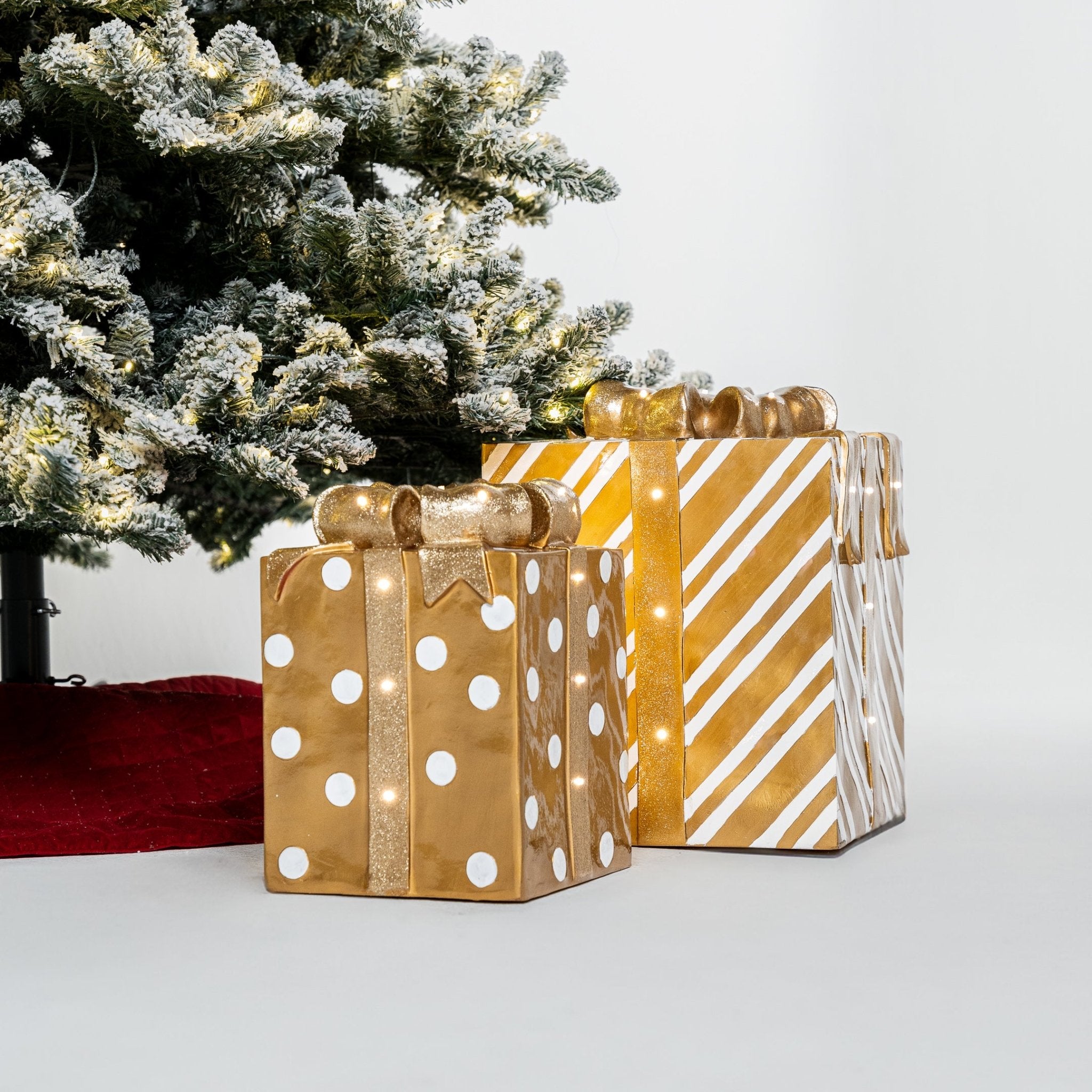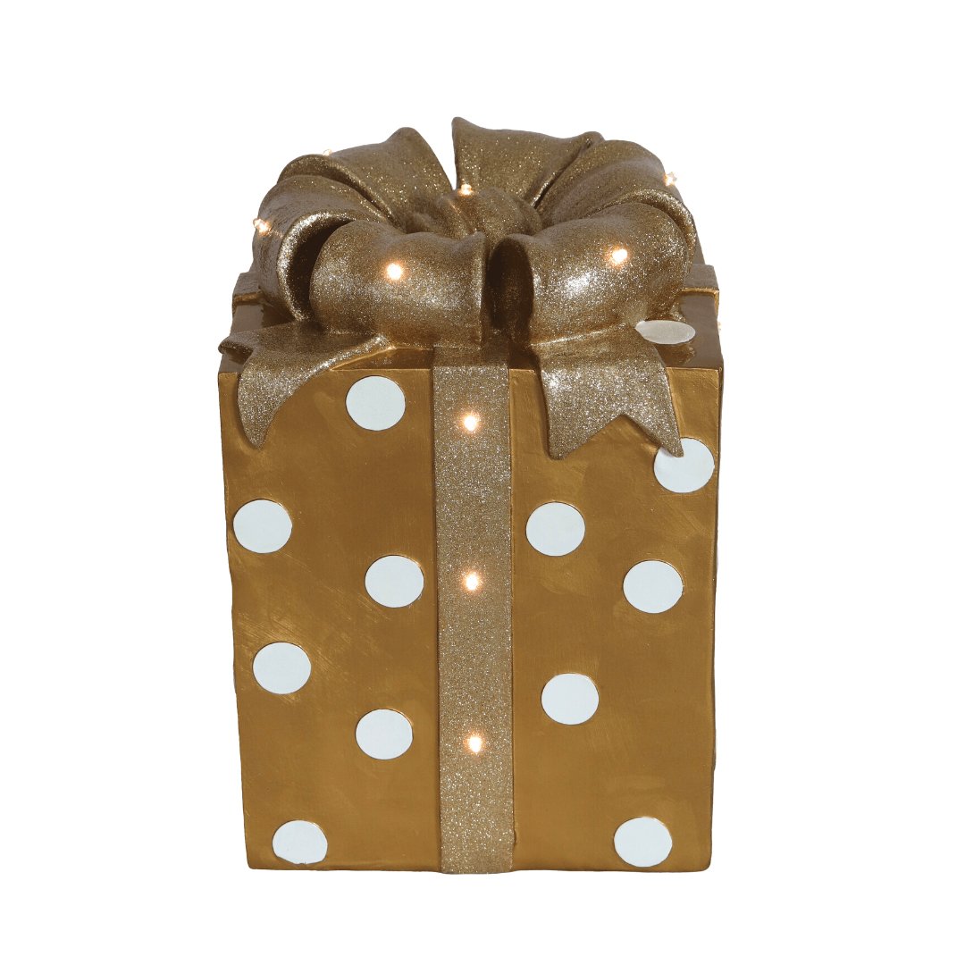 A classic and traditional festive decoration gift-box, in an elegant brown shade with a classic white polka dotted pattern. The LED lights on this gift-box packaging and the glitter ribbon detailing add to the beauty of this decoration and make it an absolute must-have.