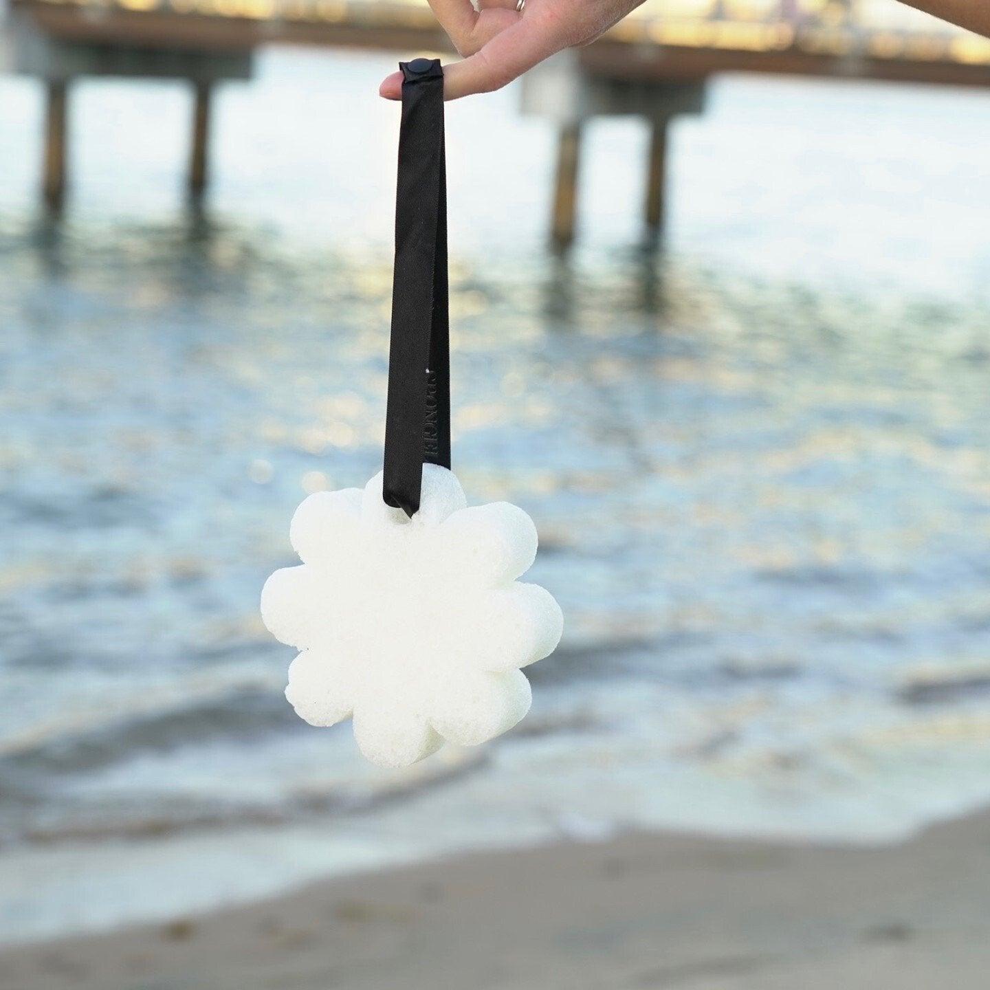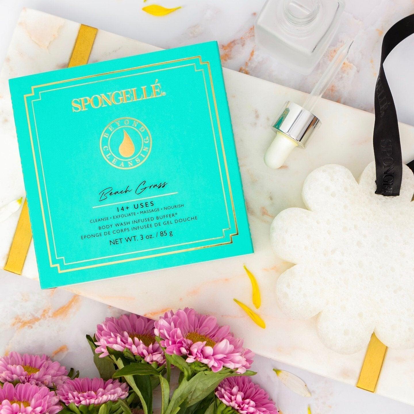 Placing the body wash infused buffer under running water reveals a beach grass fragrance and a milky, airy cloudlike foam which exfoliates, massages & pampers all skin types. Patented technology ensures a minimum of 14+ washes. Rinse and squeeze out excess water after each use. Sponge can be repurposed after complete use.