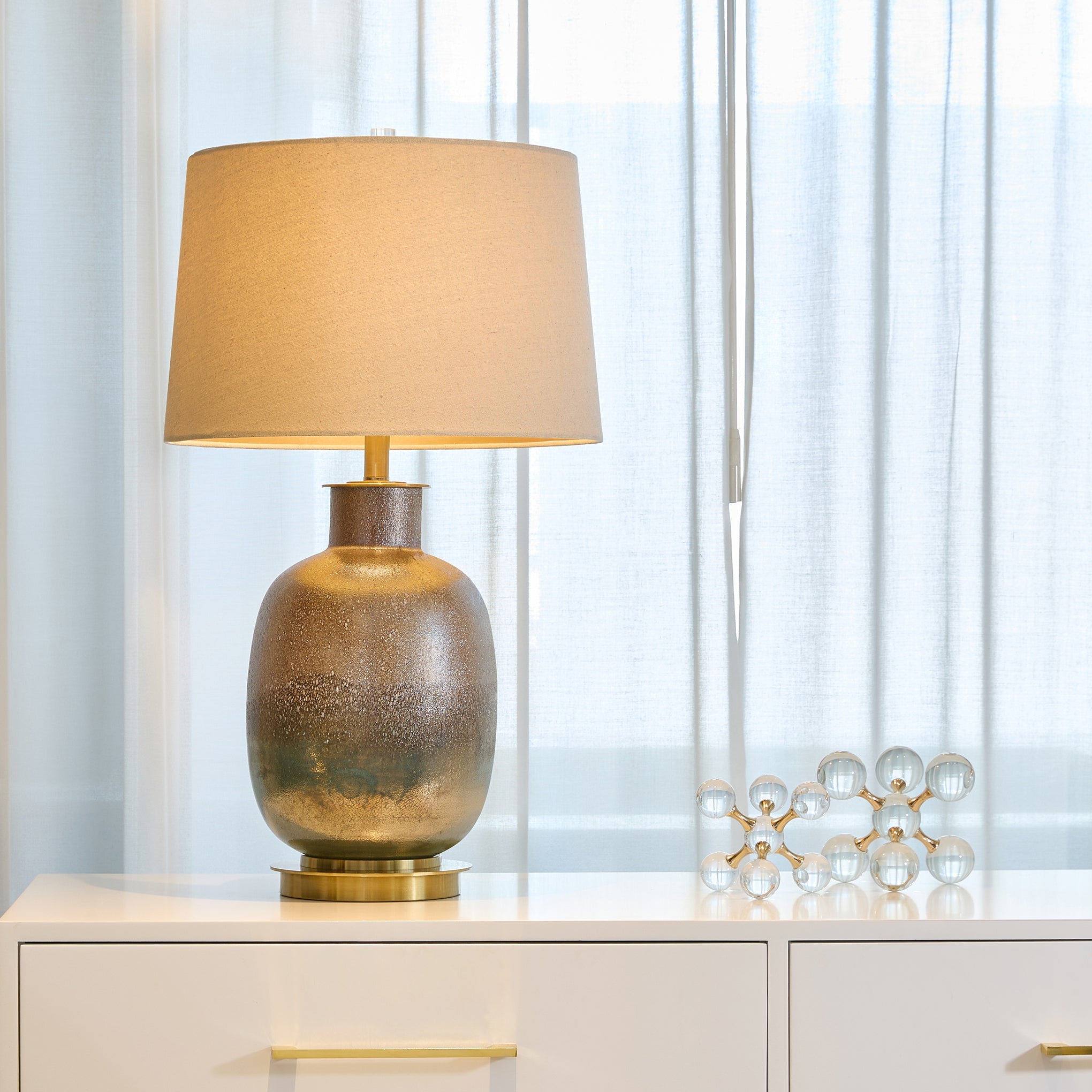 Introducing the Charlotte Glass Table Lamp, exquisitely designed to elevate any space with its luxurious brown color. Crafted with a sophistication that alludes to the world of art and literature, this lamp is the ultimate statement piece for those seeking an exclusive touch. Enhance your decor and bask in the tasteful ambiance this lamp provides.