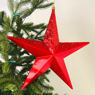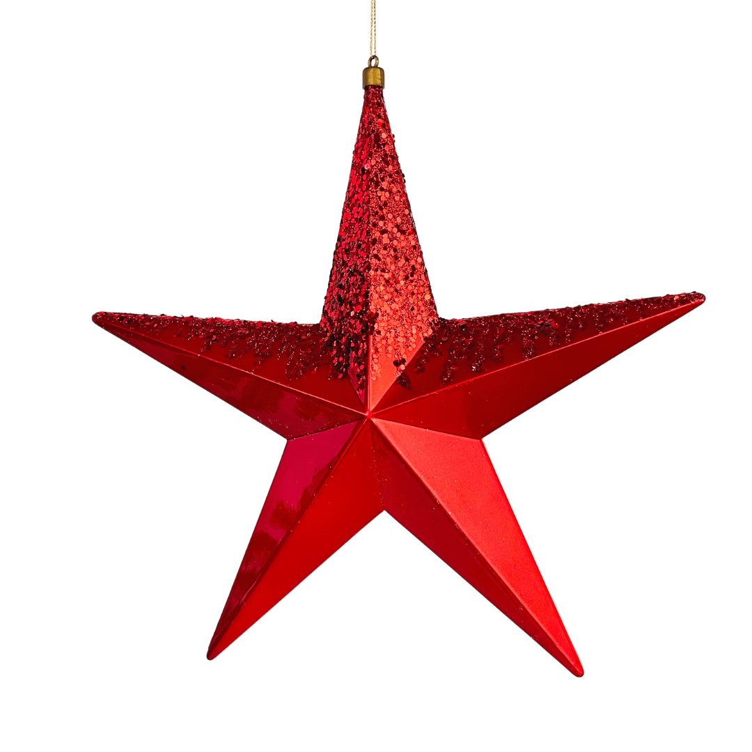 Decorate your Christmas tree with this shatterproof star ornament covered with red glitter against a matte red canvas.