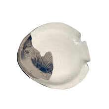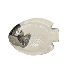An artisanal fish platter in a stunning white enamel finish with subtle hand-crafted detailing in gold on the head-end and on its curvaceous rims.