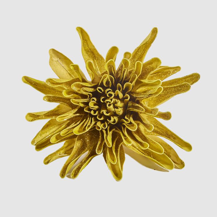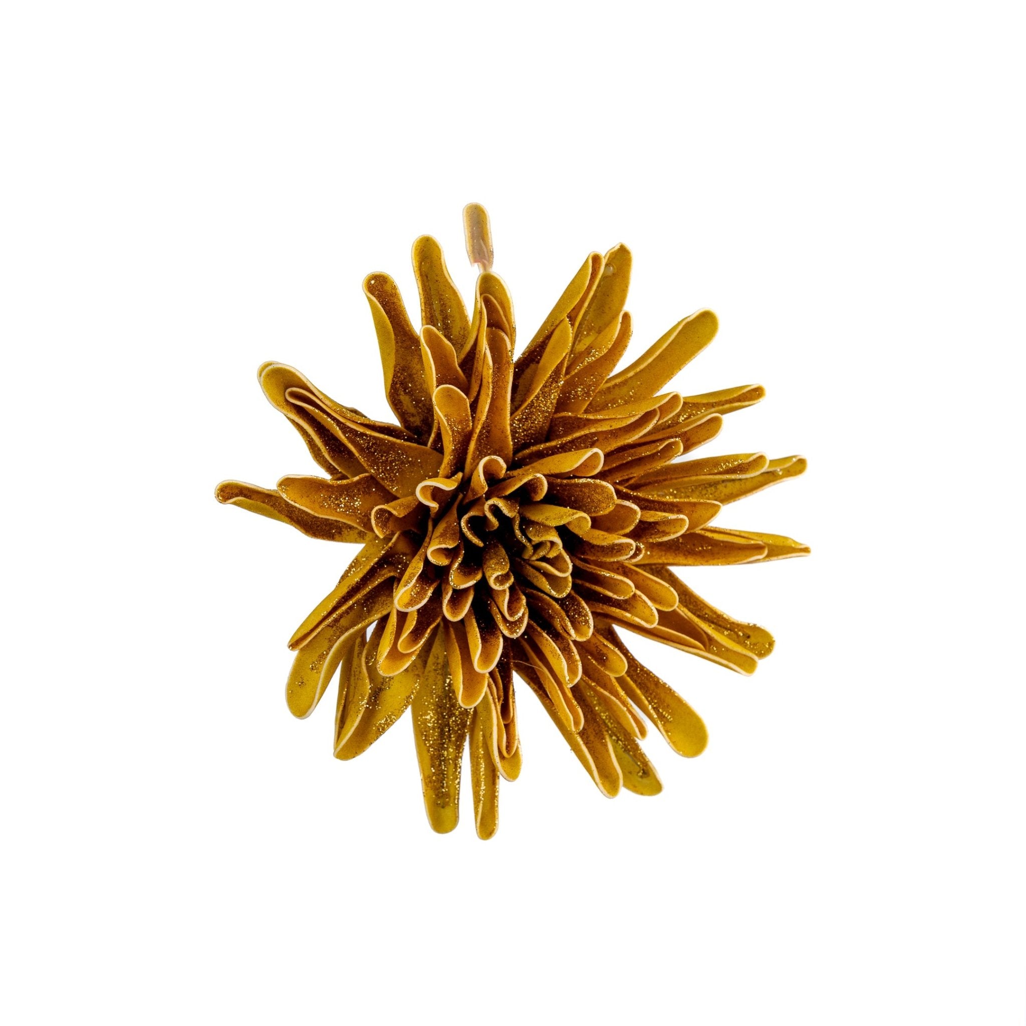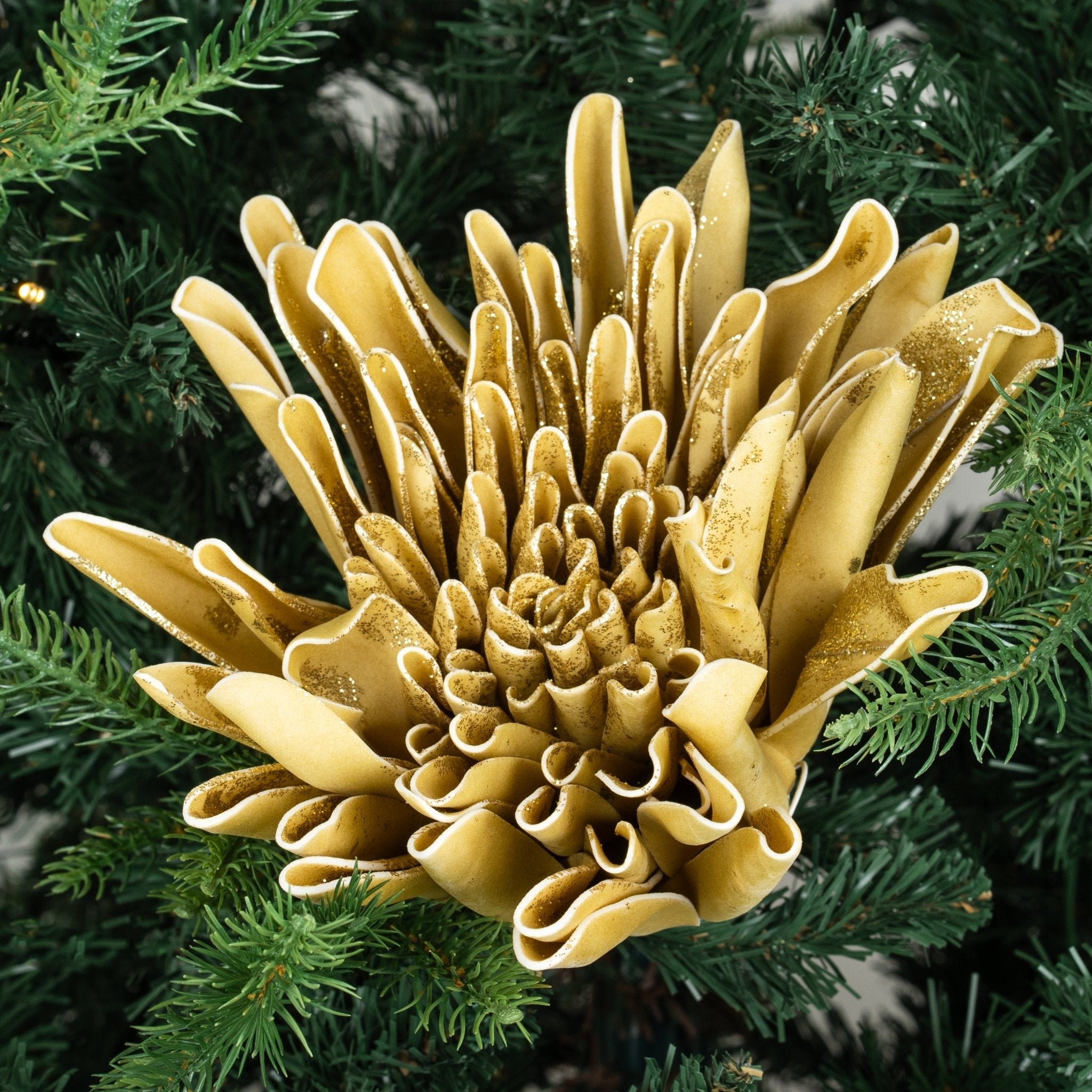 An elegant gold dahlia flower head made of foam and glitter adorns your Christmas tree with timeless beauty. Perfect for creating a luxurious, exclusive look in your home this holiday season.