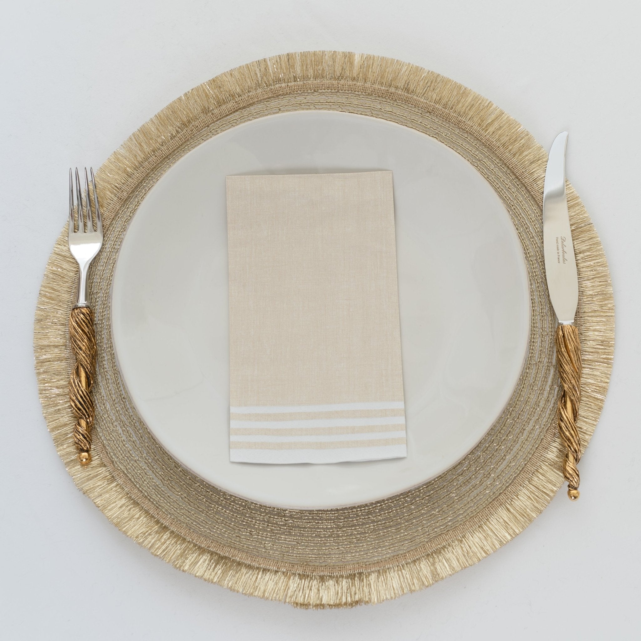 Bring a touch of luxury to your table with this exquisite set of four gold bohemia jute placemats, crafted from natural jute fibers for a luxurious texture and natural beauty. This placemat adds a subtle yet sophisticated style to any dining setting, perfect for special occasions or everyday meals.