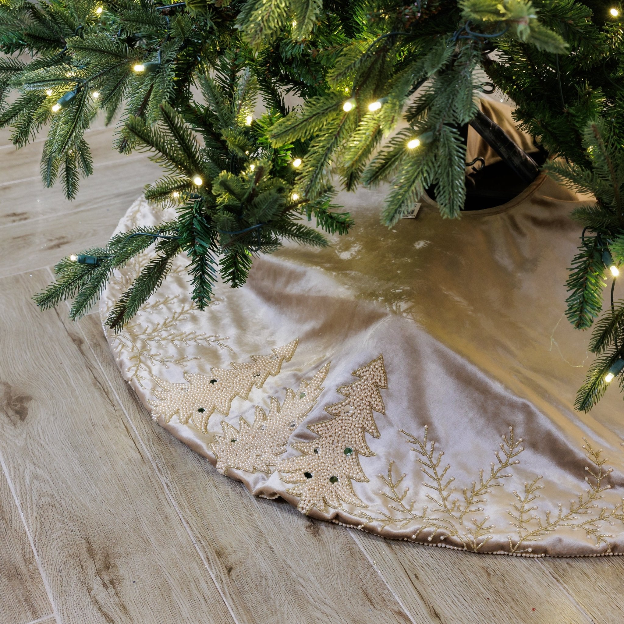 A glamorous and shimmering Gold Velvet Tree Skirt with Beads, Stone and Hand Embroidery on the tree skirt border. For creating a special place under the Christmas tree where you can stock all your gifts, this Christmas tree skirt is a beautiful addition to your festive decorations.