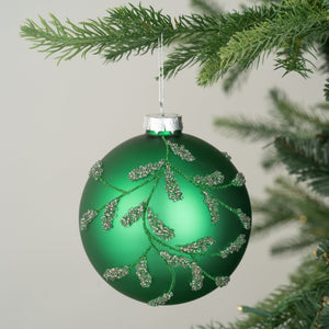 Add a touch of elegance to your holiday décor with this luxurious green ball ornament adorned with glittery fern detailing. Perfect for adding a hint of sophisticated sparkle to your tree, this exclusive ornament is sure to become a treasured part of your family's holiday traditions.