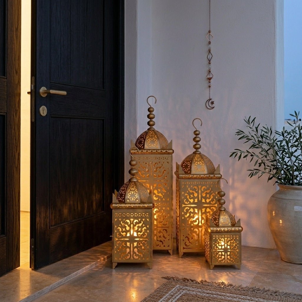 Whether styled individually or arranged as a layered set, the warm golden glow transforms any room into a serene, celebratory ambience. Perfect for mantels, entryways, majlis settings, and Ramadan gatherings, these lanterns bring cultural richness and elevated beauty to every corner of your home.