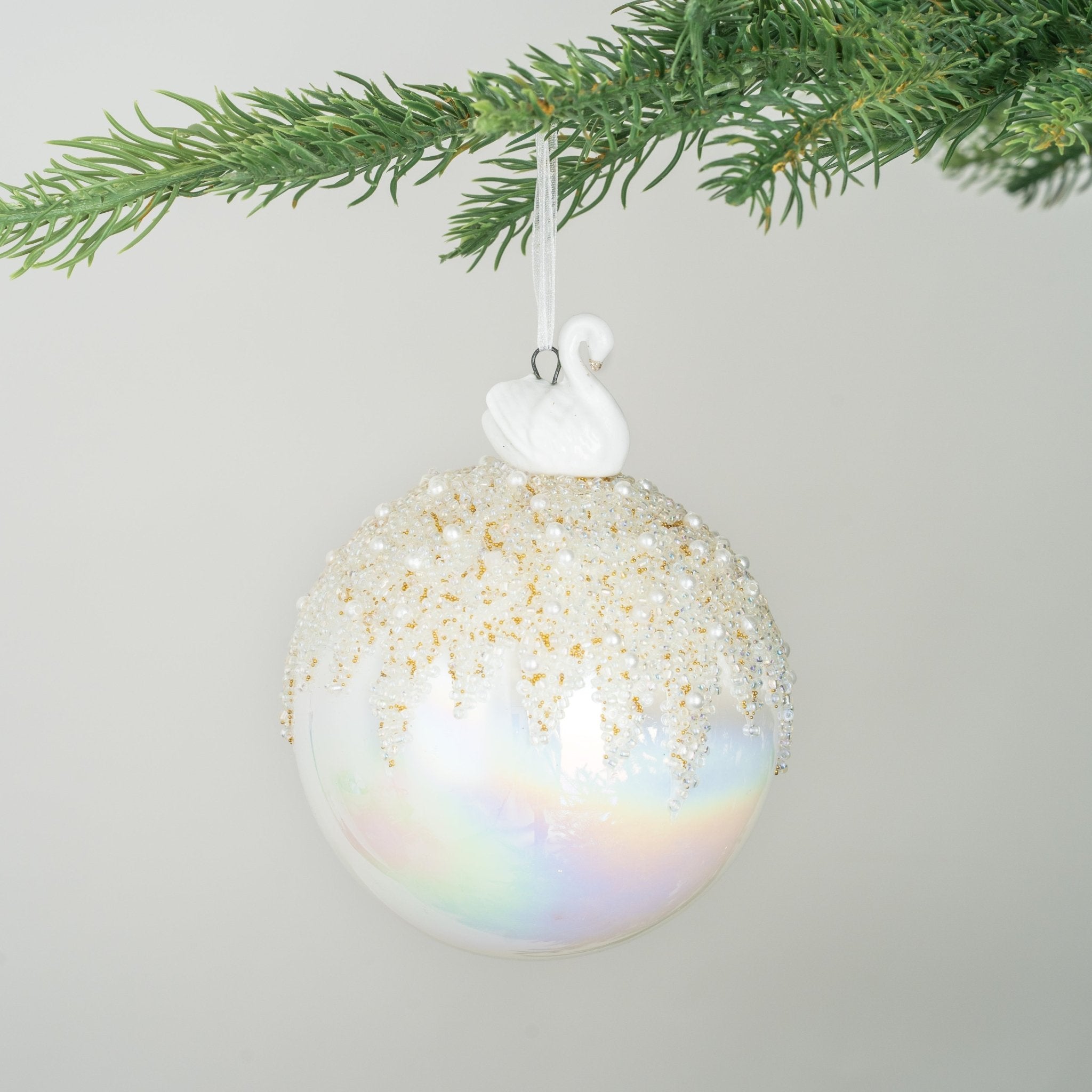 Iridescent Ball Ornament with Swan Figurine