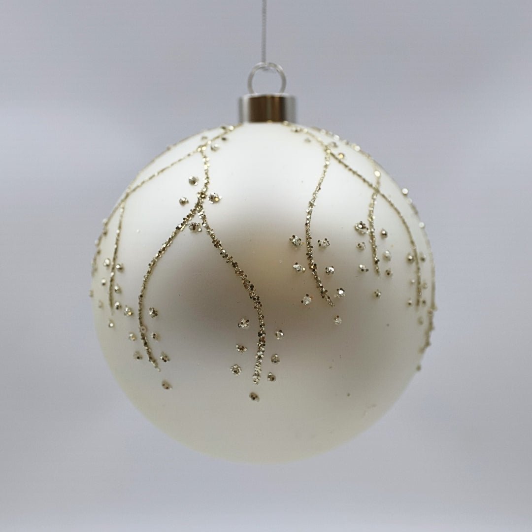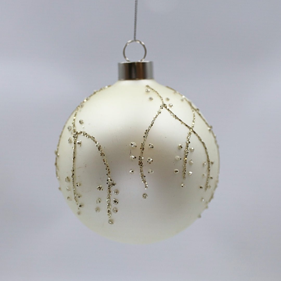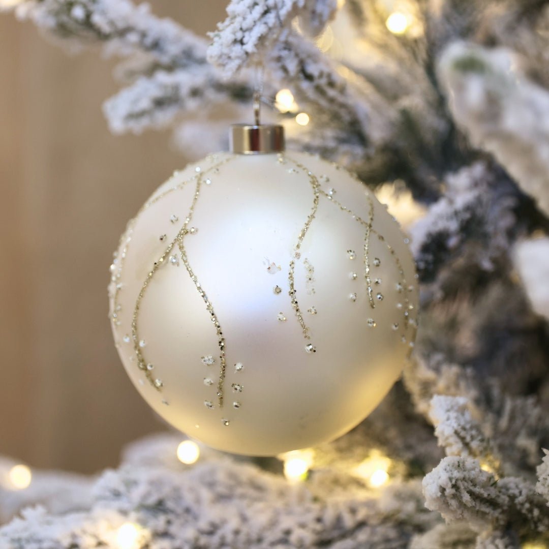 Elevate your holiday décor with this radiant white ornament, delicately decorated with a sparkling glitter motif. The crisp white base and subtle shimmer create a soft, wintry glow under twinkling lights. Perfect for styling solo or layered, it adds refined elegance to any tree or garland. Available in two sizes : 13cm , 15cm.