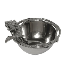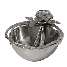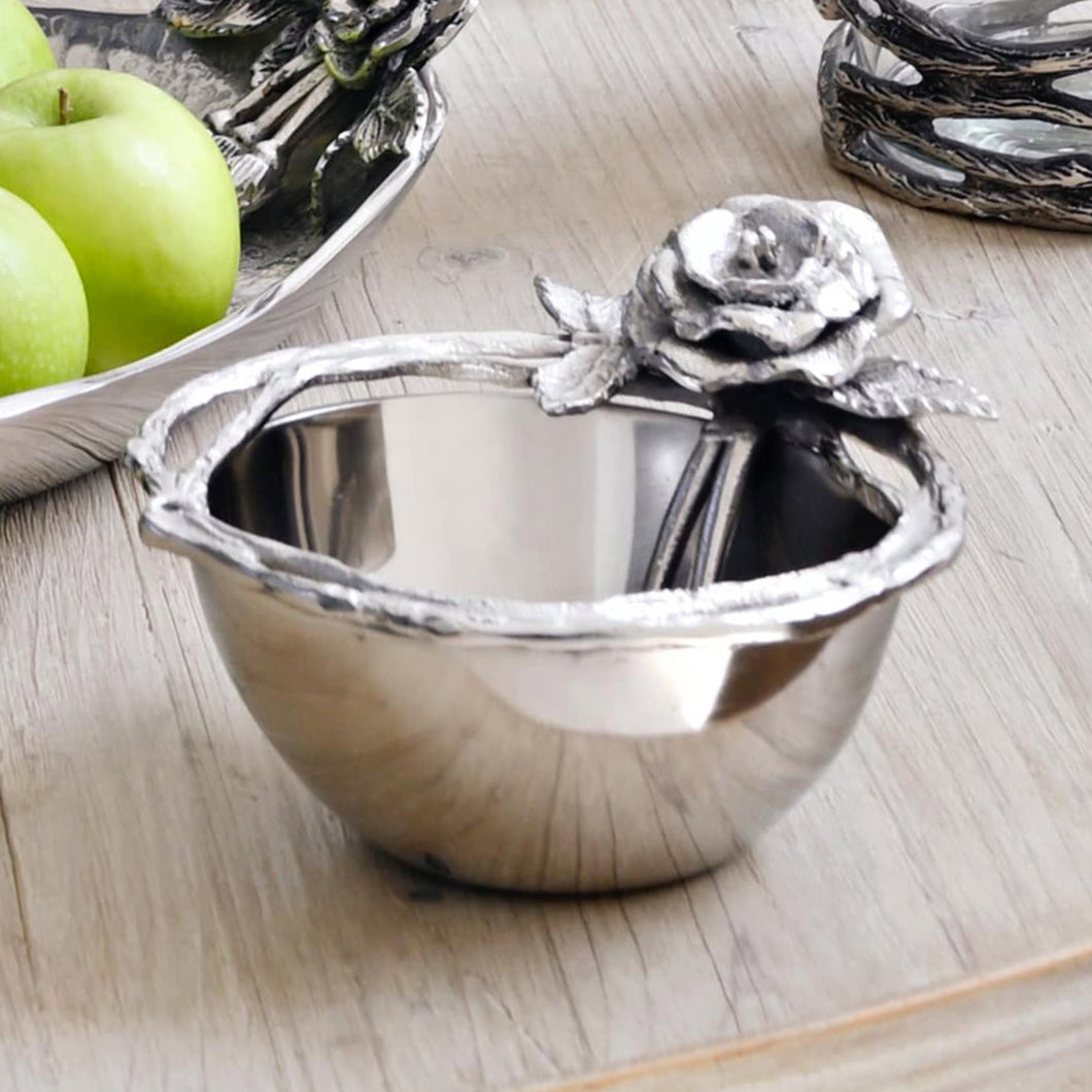Antique rose detailing, a rose stem-inspired rim, and a sleek metal body, make this nappy bowl the perfect addition to your dinnerware collection, and adds that luxurious touch to your collection.