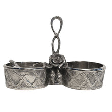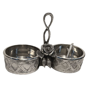 Delicate antique rose to detail accents the elegant look of this two-section serving dish. This handcrafted serving dish features two metal sections with paired rose stem-inspired spoons.