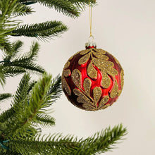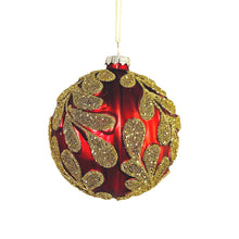 Create a spectacular holiday display with this red ball ornament with antique gold motif detailing in festive leaf patterning, and gilded in golden glitter, and add a unique charm to your festive decoration theme.
