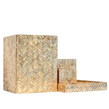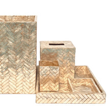 Stunning smoked herringbone pattern in a marvelous golden hue; this beautiful bathroom set of five is a premium addition to any bathroom. The tray rests perfectly on your bathroom counter, and a classic silk tissue holder rounds out the set. All items are handcrafted from premium quality capiz shells with attention to every detail.